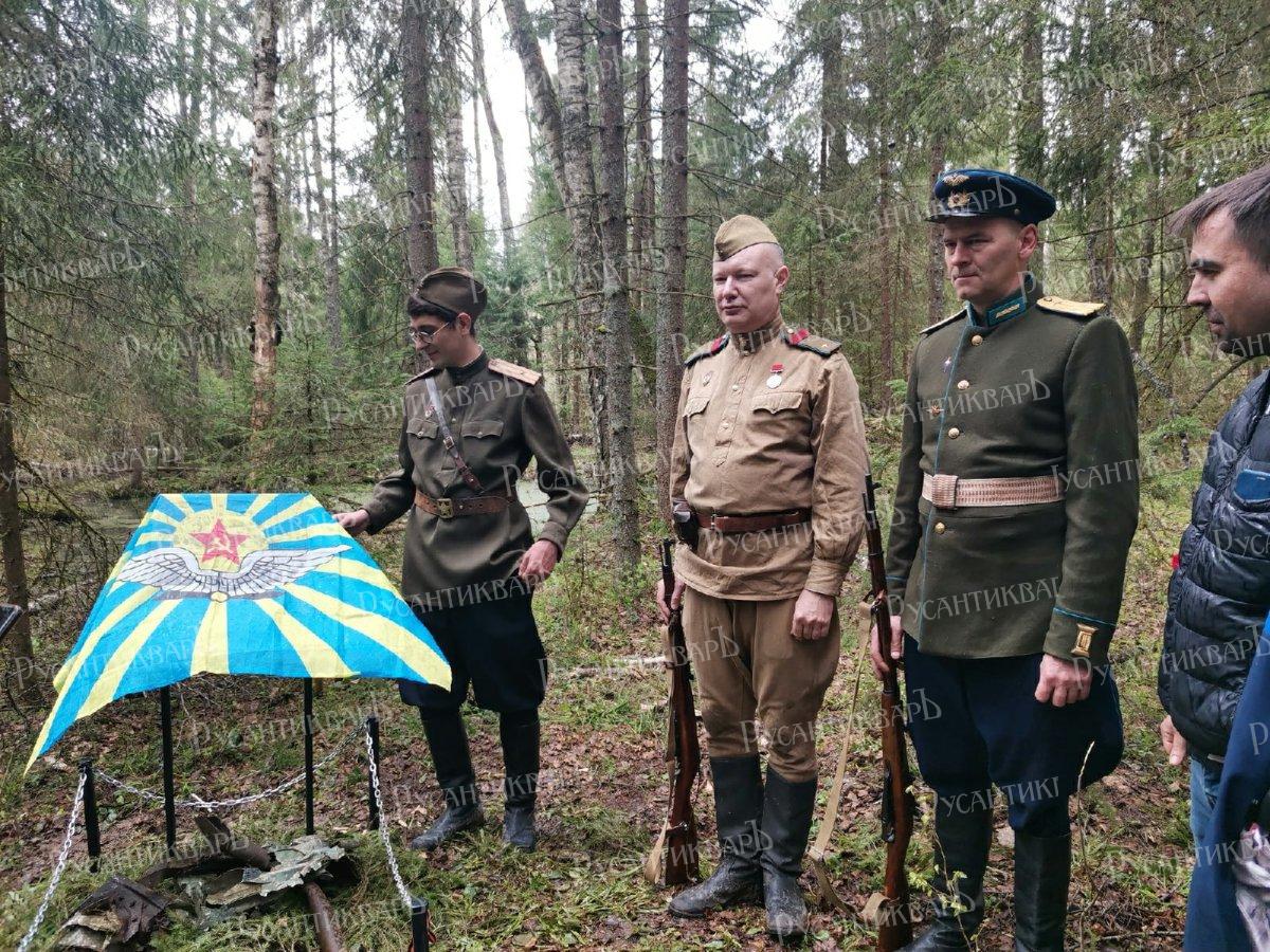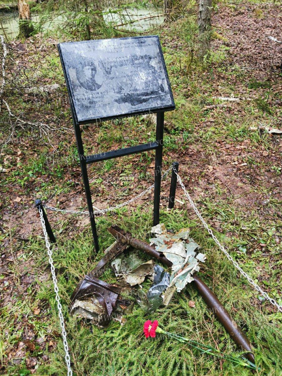 Как выяснилось дальше, воронка оказалась местом падения самолёта. Его фрагменты были разбросаны на большом расстоянии от центра падения. Стало ясно, что здесь произошёл взрыв огромной силы. При первичном обследовании удалось обнаружить фрагменты стоек шасси, моторамы, обшивки с элементами нанесенной на неё красной звезды, шкалу радиостанции «Двина», остатки разорванного боекомплекта от авиационной пушки Березина 12,7 мм, несколько лючков-«стелек», куски моторов. Но что поразило, был найден фрагмент расколотой бронеспинки пилота самолета Пе-2, на котором было выцарапано «Здесь погибли советские авиаторы». Стало понятно, что мы наткнулись на место падения самолёта Пе-2, и именно это место было нанесено на топографическую карту как братская могила.