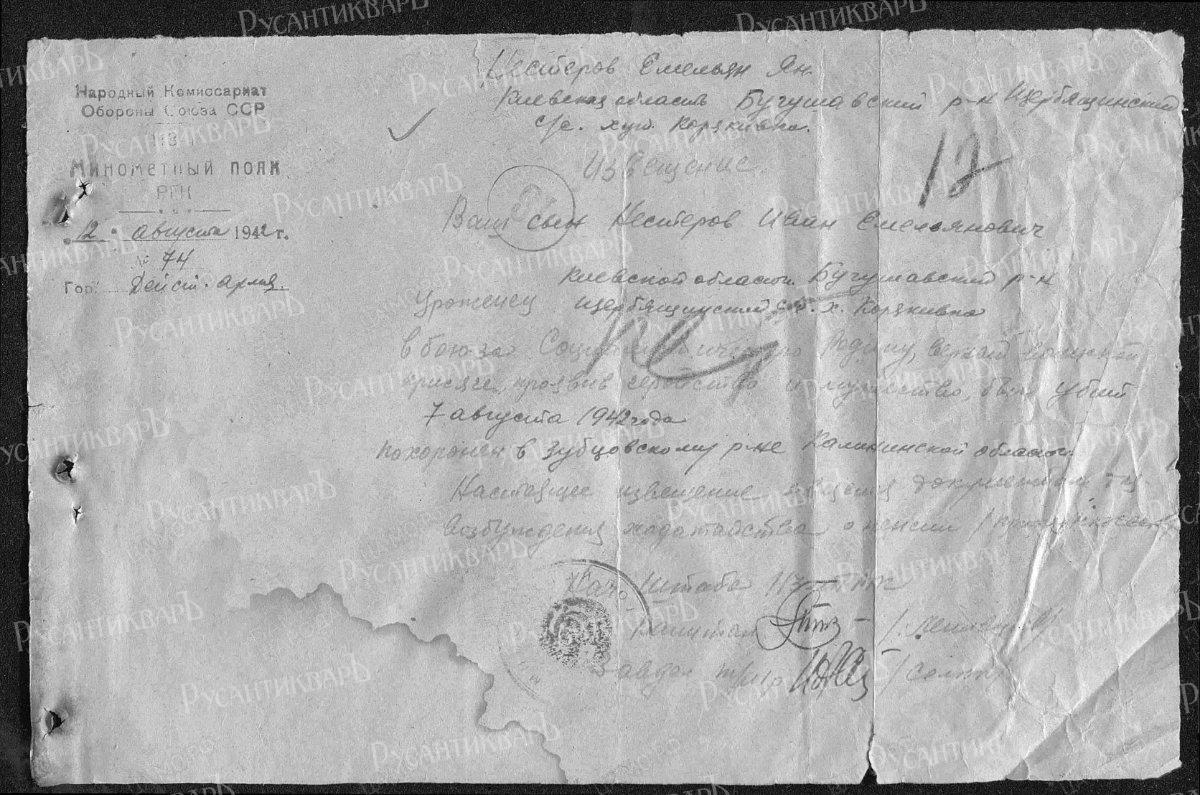 Кроме того, в ЦАМО РФ хранится извещение на Нестерова И.Е. от 12 августа 1942 года, которое было направлено отцу Ивана Емельяновича начальником штаба 113-го миномётного полка РГК .