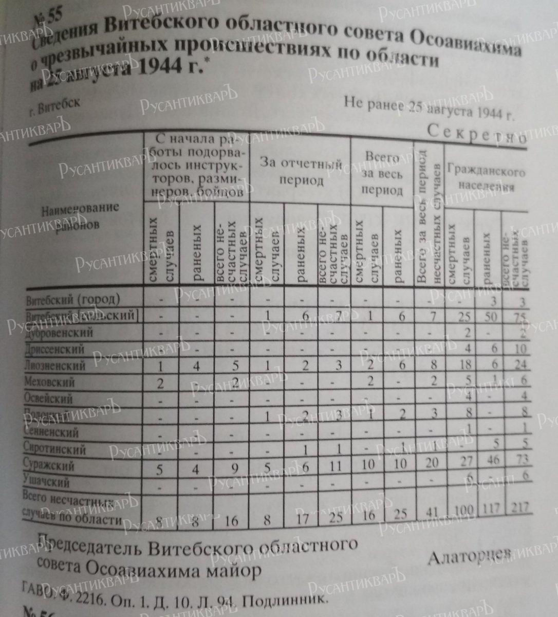 В докладной записке секретарю Витебского горкома КП(б)Б о работе военного отдела за период с 26 июня 1944 г. по 1 июня 1945 г. сообщалось: «полностью просмотрены все жилые и служебные строения города, где обнаружено и снято: а) противотанковых мин 1921 шт., б) мин сюрпризов 218 шт., в) подорвано мин разных систем 1914 шт. Вся просмотренная и очищенная площадь составила 23310 га. Огромная работа проведена по очистке города от боеприпасов, собрано и складировано на ст. Медведка: а) снарядов разных 40947 шт., б) мин 3989 шт., в) отечественных снарядов 606 шт., г) патронов 50000 шт. Собрано и складировано в городе, так как за отсутствием транспорта и горючего транспортировать горсовет Осоавиахима не смог: а) артиллерийских снарядов разных 21195 шт., б) мин 1059, в) патронов разных 10970, г) головок от артснарядов 3000 шт. Кроме этого собрано трофейного вооружения: пушек разного калибра 75, минометов 21, пулеметов 731, винтовок 3837, гильз от артснарядов 55500» [14, л. 21].