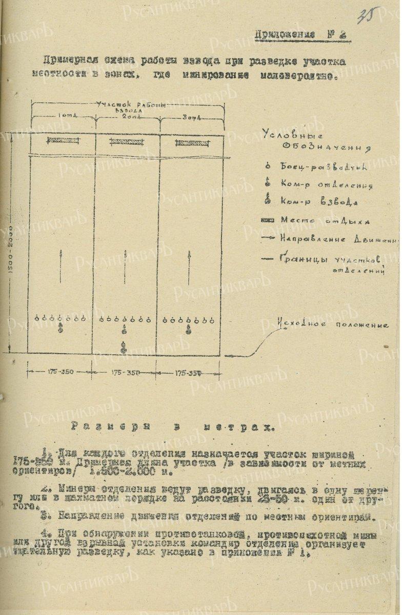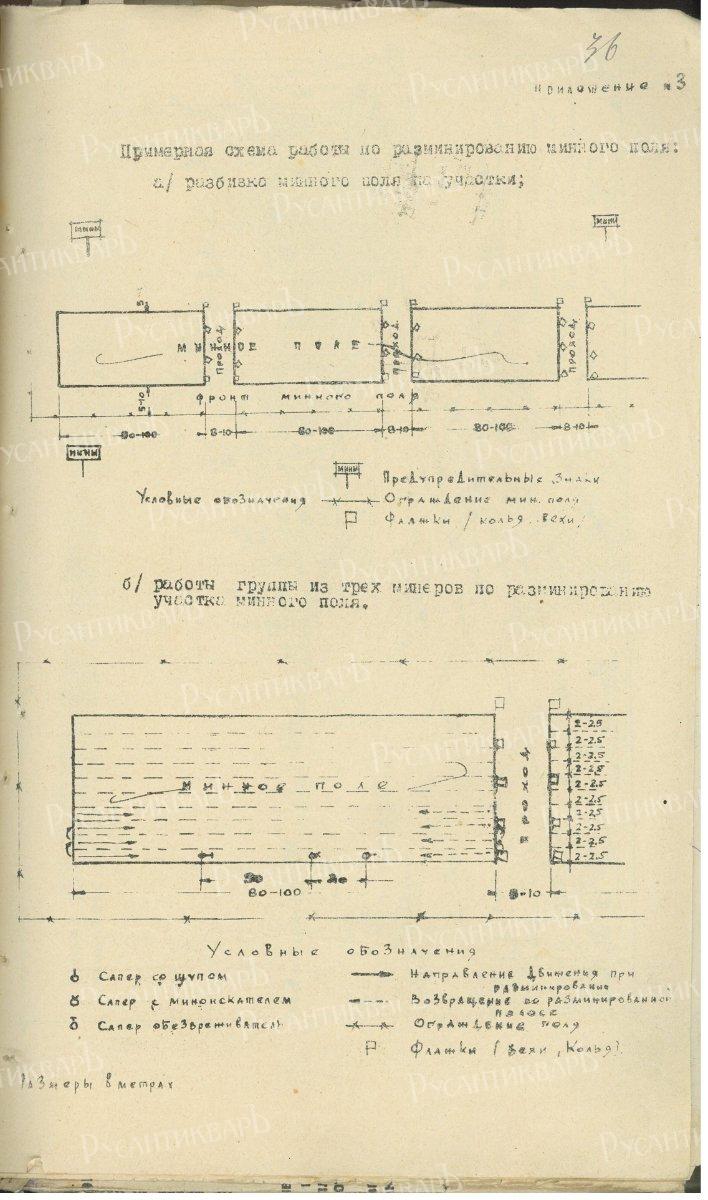 В своей работе районные команды разминёров Осоавиахима руководствовались инструкцией от 25 марта 1944 г. В частности, в приложениях к ней были указаны примерные схемы работы взвода при разведке участка местности в зонах, где минирование маловероятно и в местах вероятного расположения минных полей. В первом случае разминёры должны были двигаться в одну шеренгу или в шахматном порядке на расстоянии 25 – 50 метров друг от друга, а при обнаружении мины произвести более тщательную разведку. Для этого уже были задействованы пары минёров, где один работал щупом, а второй – миноискателем и коротким щупом. Им предстояло обследовать полосу шириной 2 – 2,5 метра [17, л. 34 – 37].