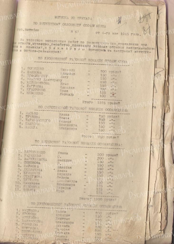 В Лиозненском районе протоколом заседания РК КП(б)Б от 9 июня 1944 г. представлены к награждению медалью «За отвагу» Довальцева Нина Исааковна, 1926 года рождения (лично разминировала 18 мин, собрала и обезвредила 220 мин, очистила от мин и снарядов площадь 50 га), Шляпо Эдуард Андреевич, 1927 года рождения (обезвредил 376 мин, подорвал 263 шт., подорвал снарядов 59, вынес миномётных мин 3700 шт., очистил площадь в 88 га) [13, л. 67]. Высоцкий Степан Павлович, 1927 года рождения, представлен к награждению медалью «За боевые заслуги» (лично разминировал 103 мины, собрал и уничтожил 110 мин, обезвредил 277 снарядов, совместно с группой в 4 человека разминировано 117 мин, собрано и обезврежено 669 снарядов и 7 авиабомб, уничтожено 200 снарядов и 900 мин) [9, л. 69].