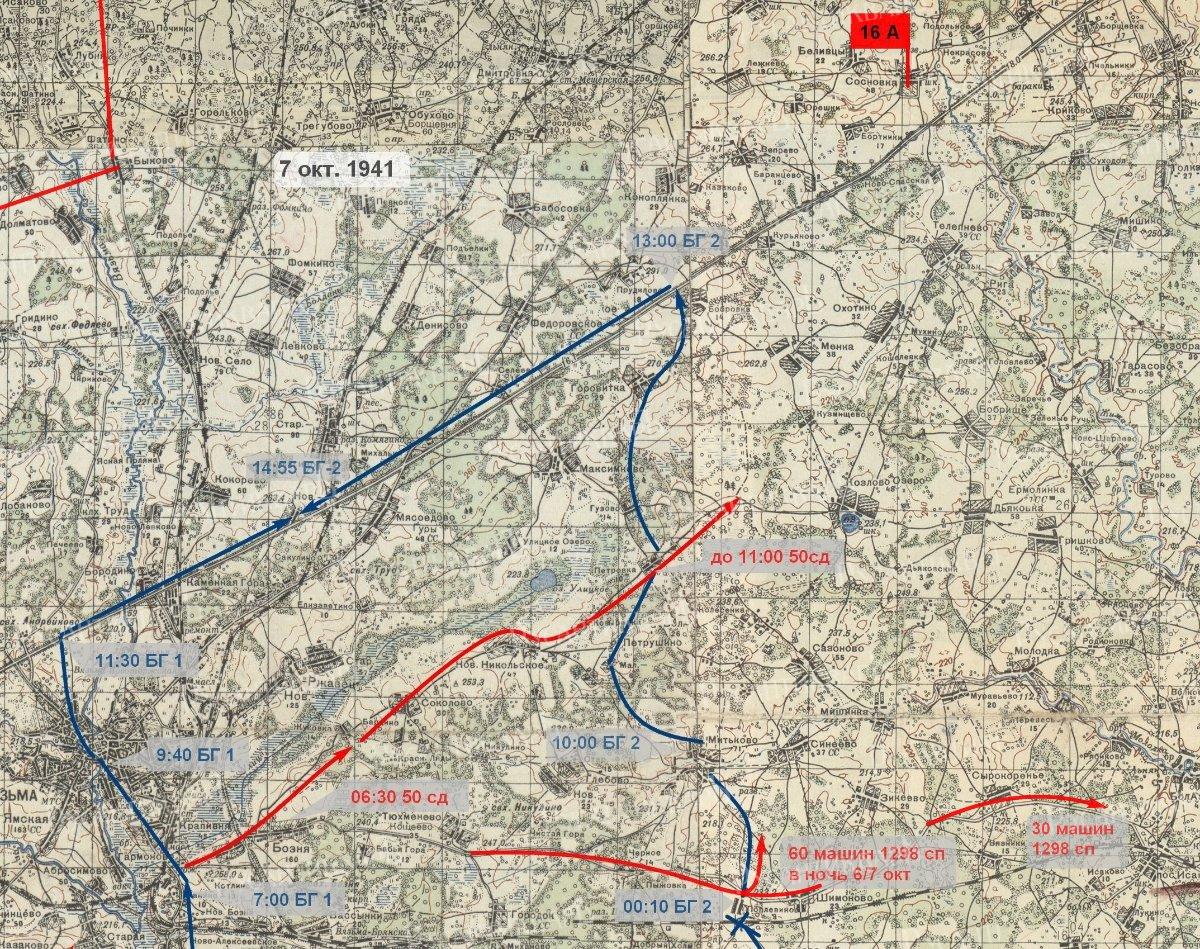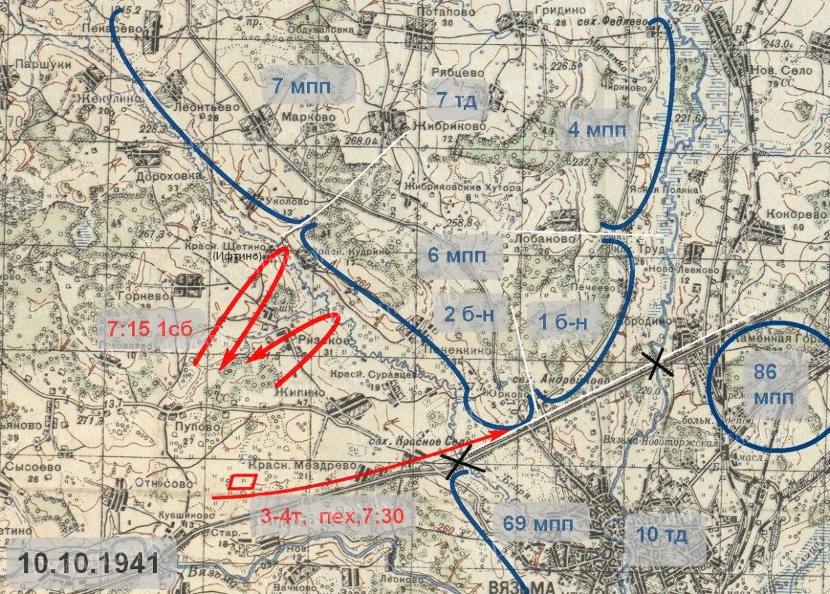 Оказалось, что дивизии 7-го ак вышли на автомагистраль ранее 87-й пд и, перейдя ее, достигли реки Вязьмы. Произошло это во второй половине дня 10 октября, а на 24:00 9 октября части 7-го ак находились еще в 12 км южнее р. Вязьмы.