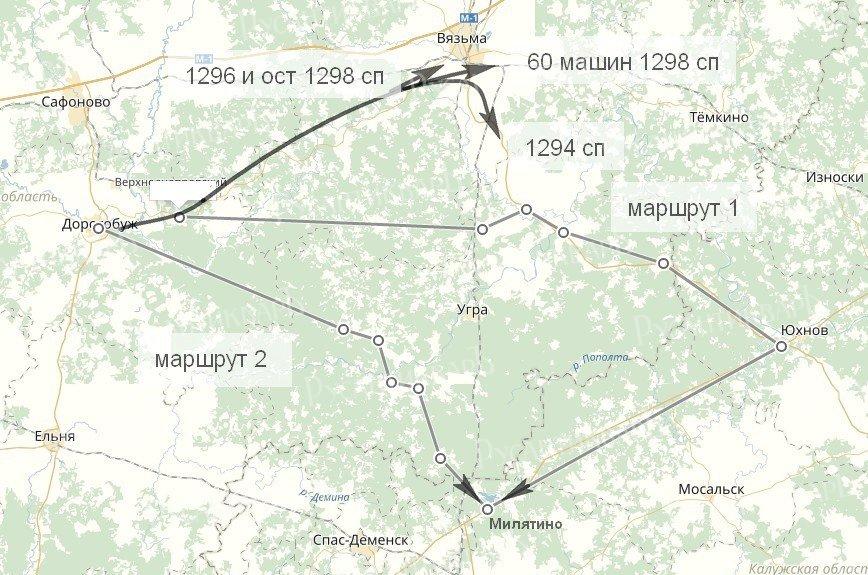 Цитирую Суровцева (стр.22), сначала цитата из документа, потом текст Суровцева: «29-ю сд 32-й армии с 533 ап ПТО перебросить автотранспортом из района Дорогобужа в район Куземки на рубеж реки Мал. Ворона, чтобы перехватить шоссе на Юхнов».