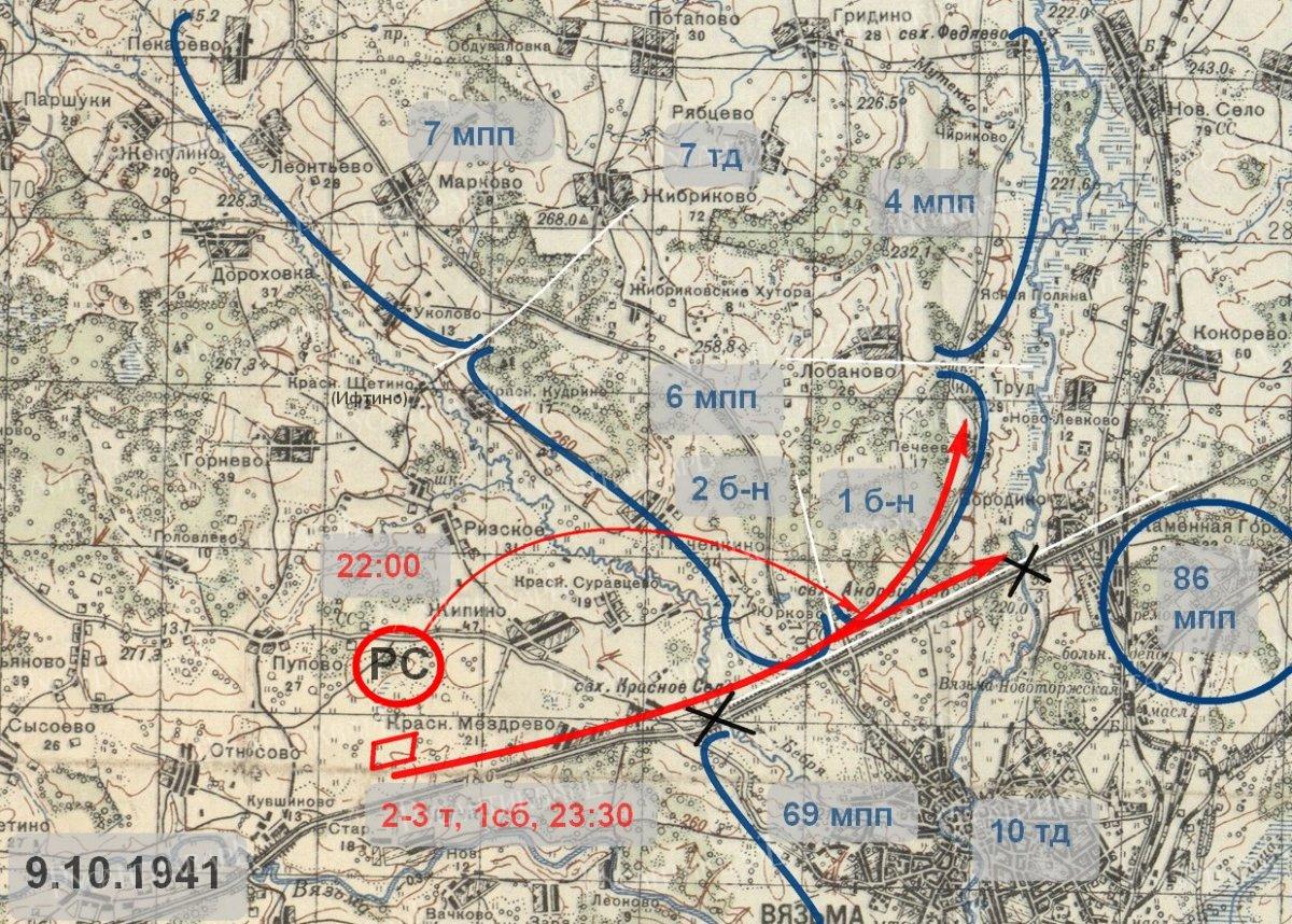 267-я пд перешла Минское шоссе двумя полками в границах Таратоново – Коробово, а 23-я пд – Коробово – мост через р. Вязьму. На карте 7-го ак части обеих дивизий на 24:00 10 октября показаны на южном берегу реки Вязьмы . Рис. 12.