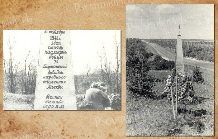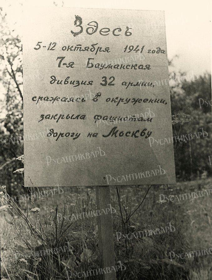 Первоначально, вероятно, был щит с надписью «Здесь 5-12 октября 1941 года 7-я Бауманская дивизия 32 армии, сражаясь в окружении, закрыла фашистам дорогу на Москву». Рис. 9.