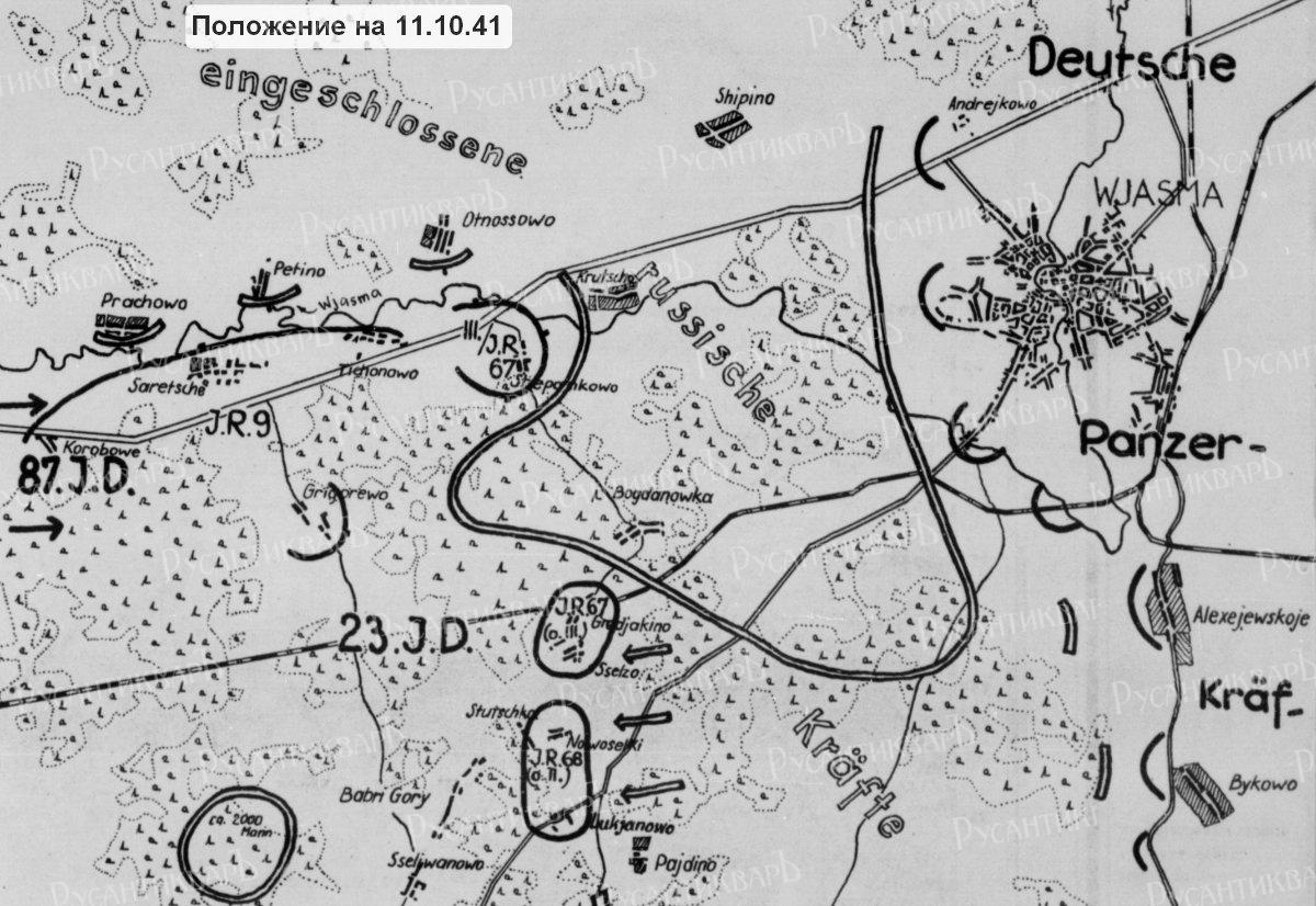 Выдержки из донесения 6-го мп : «Вечером 11.10.41 усилился шум боя на правом крыле. Полк получил сообщение, что русские большими силами в 7-м мпп прорвались. На это 2-я рота 25-го тп за правое крыло 8-й роты подтянулась, чтобы прикрыть правый фланг полка. Также ездовых поставили на позиции против прорыва в 7-м мпп. Ночь с 11 на 12 октября прошла спокойно.