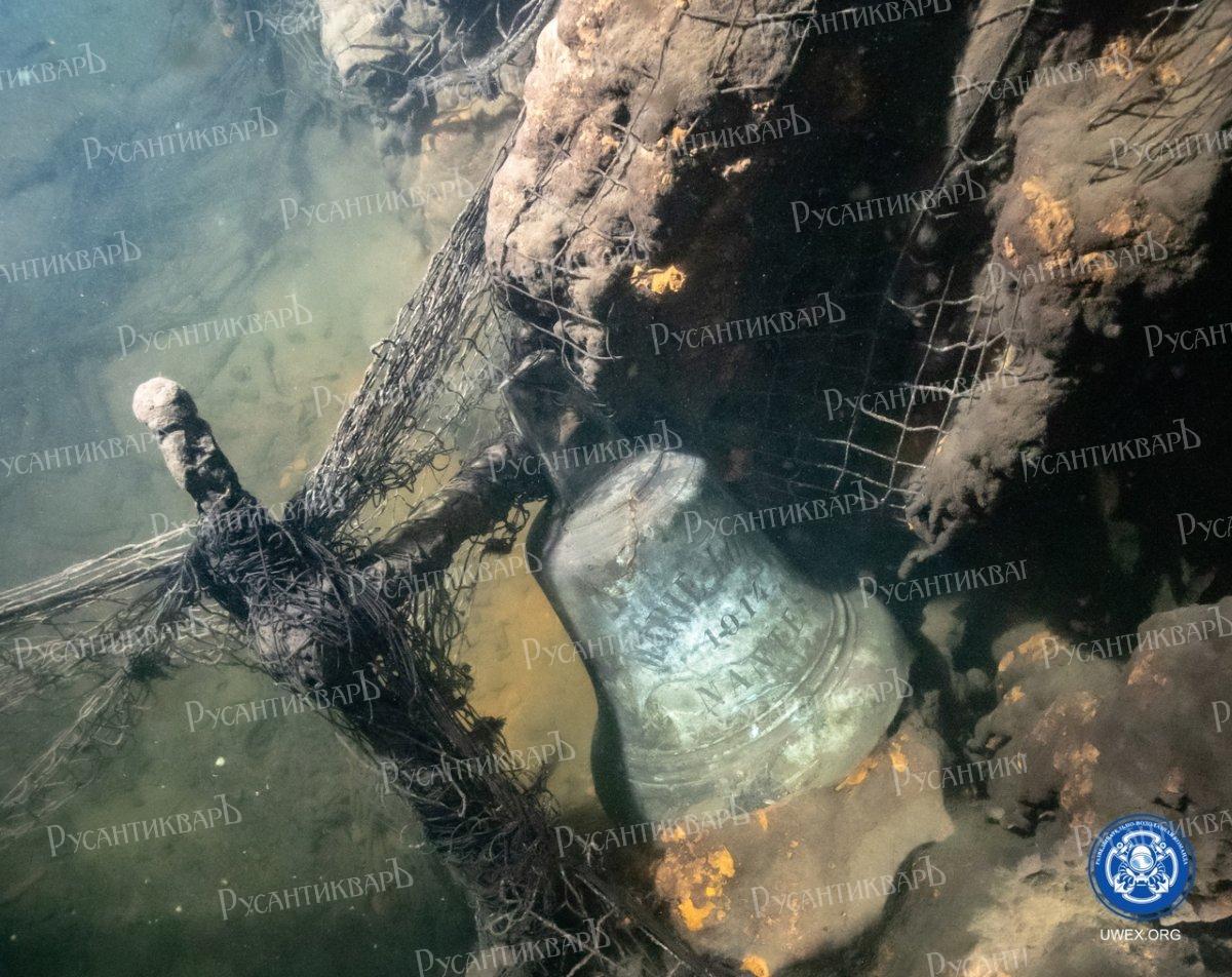 Однозначная идентификация «Калпакса» стала возможна после находки на носовой оконечности судна колокола с первоначальным названием транспорта - «Marie Louise» и указанием года и места постройки – 1914, город Нант. (фото 2).