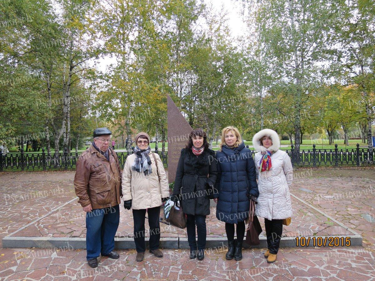 У памятника в Школьном сквере (слева направо): Тихонов И.С., Бухарина Б.Х., племянницы Нейланда О.П. Людаева Светлана Юрьевна (из Севастополя) и Малинина Алёна Юрьевна (из Санкт-Петербурга) и московская подруга.