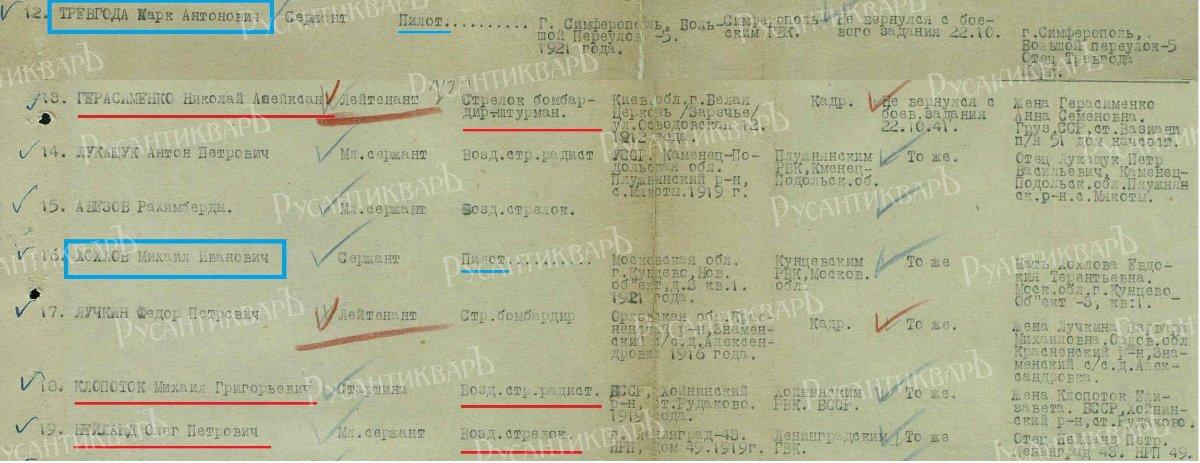 1. Список потерь 26-й АДД за октябрь 1941 г., где воздушный стрелок-радист старшина Клопоток записан как Михаил Григорьевич, 1919 г.р., родом из БССР Хойникский р-н ст. Рудаково, призван Хойникским РВК и сообщений о нём по указанному адресу ждёт жена Клопоток Елизавета. Илл. 43.