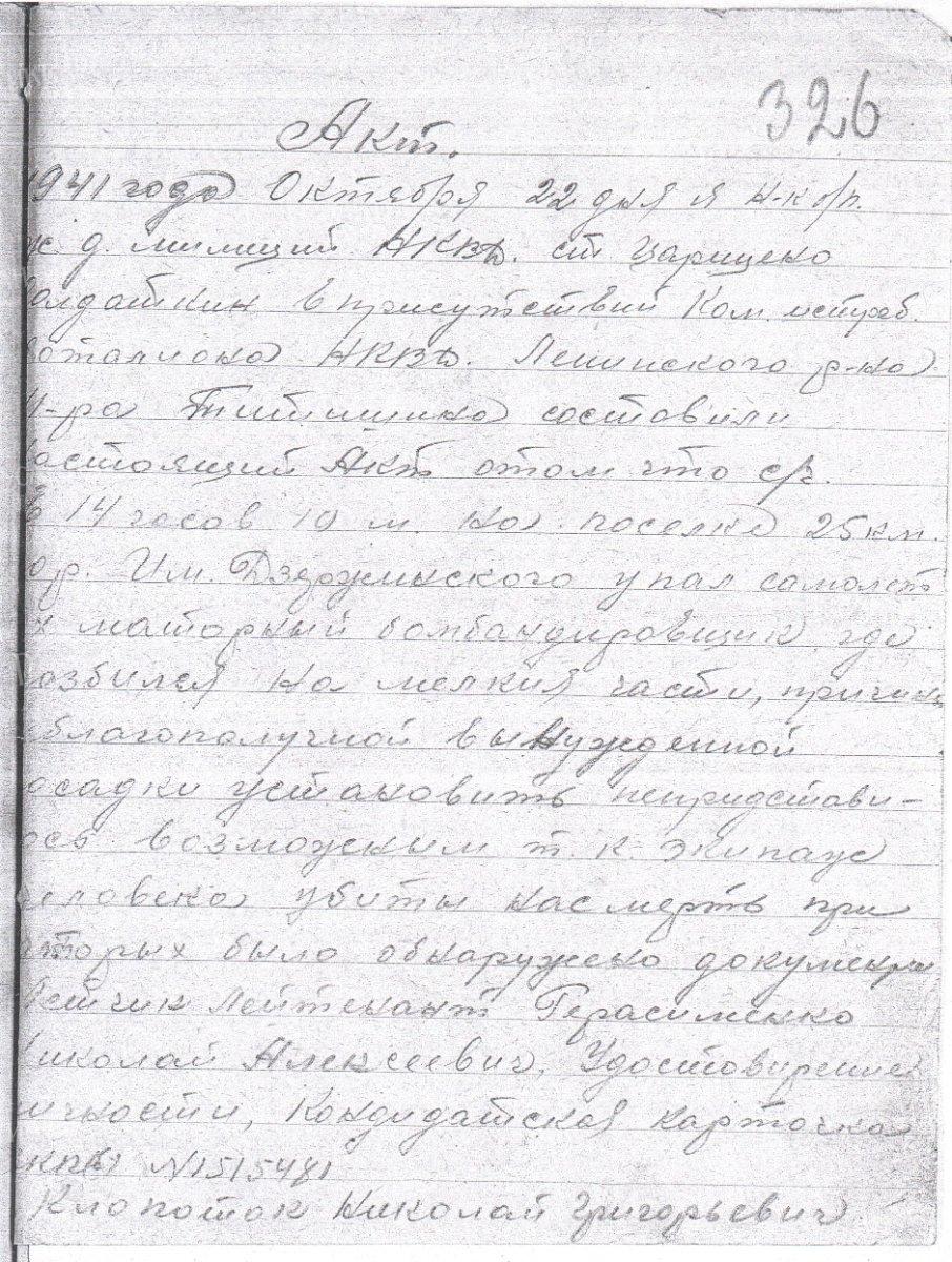 Акт о падении двухмоторного бомбардировщика, разбившегося на мелкие части на посёлке 25 км жел. дор. им. Дзержинского.
