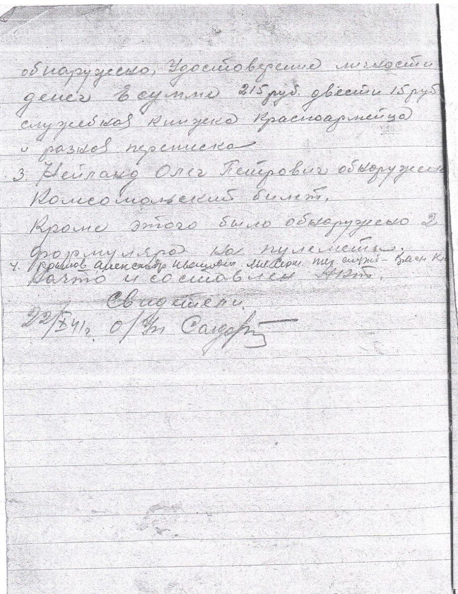 На основании приказа Наркома Обороны СССР №315/Ш от 28 января 1940 г. исключить из списков частей 1-й ОКА с 4 февраля 1940 г. личный состав: …