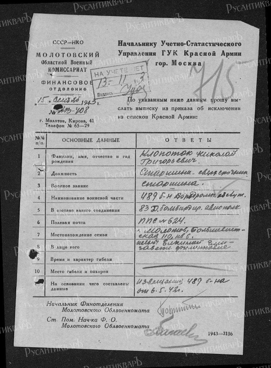 2. Распоряжение финотдела Молотовского ОВК от 15.09.43 о выдаче выписки из приказа об исключении из списков Красной Армии старшины сверхсрочника Клопотка Николая Григорьевича, служившего в 489 БАО (батальоне аэродромного обслуживания) 83-го дальнебомбардировочного авиаполка ППС №624, судя по всему после запроса жены Елкиной Елизаветы Филипповны, находившейся по адресу г. Молотов, Большевистская 110, кв.6. Финотдел указал источник сведений о гибели Клопотка: извещение 489 б-на от 6.5.42 г. Илл. 44.