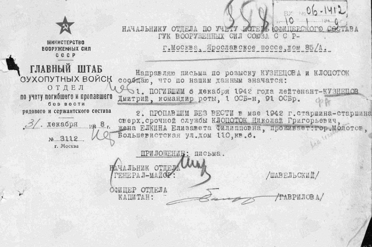 3. Документ, уточняющий потери, – из отдела по учёту погибшего и пропавшего рядового и сержантского состава сухопутных войск ВС СССР, сообщающий информацию по розыску – по нашим данным значится: ПРОПАВ-ШИМ БЕЗ ВЕСТИ в мае 1942 г. старшина сверхсрочной службы Клопоток Николай Григорьевич, жена Елкина Елизавета Филипповна проживает: гор. Молотов, Большевистская ул., дом 110 кв.6. (Как видно, это ответ на вышеупомянутый запрос Елизаветы Филипповны в гор. Молотов.). Илл. 45.