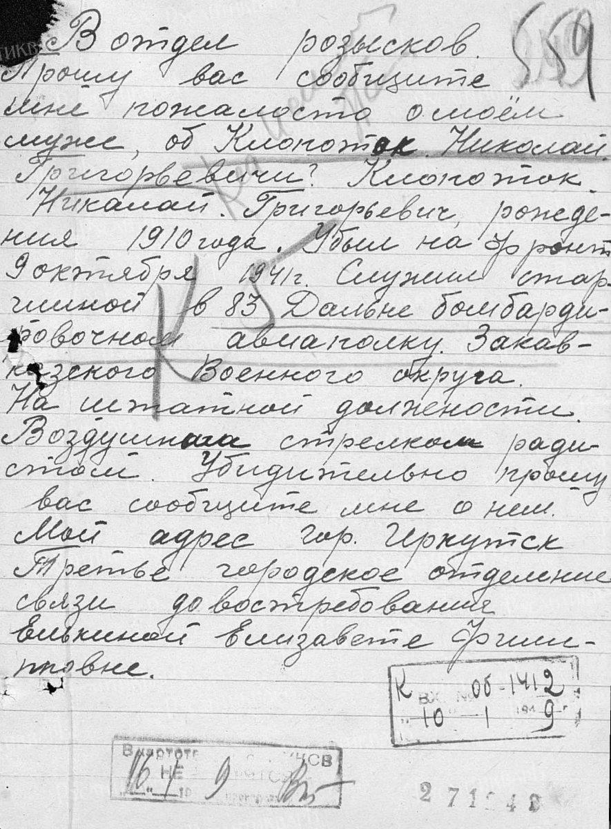 4. Запрос от 16 января 1949 г. в отдел розысков Елькиной Елизаветы Филипповны, жены Николая Григорьевича Клопотка, рождения 1910 г. Она писала: «Убыл на фронт 9 октября 1941 г. Служил старшиной в 83 Дальнебомбарди-ровочном авиаполку Закавказского Военного округа. На штатной должности воздушным стрелком радистом.» Указала адрес: г. Иркутск, 3-е городское отделе-ние связи до востребования. (Этот запрос Елизавета Филипповна, судя по датам, послала, не дождавшись ответа в Молотове и переехав в Иркутск, где ещё не нашла квартиры).
