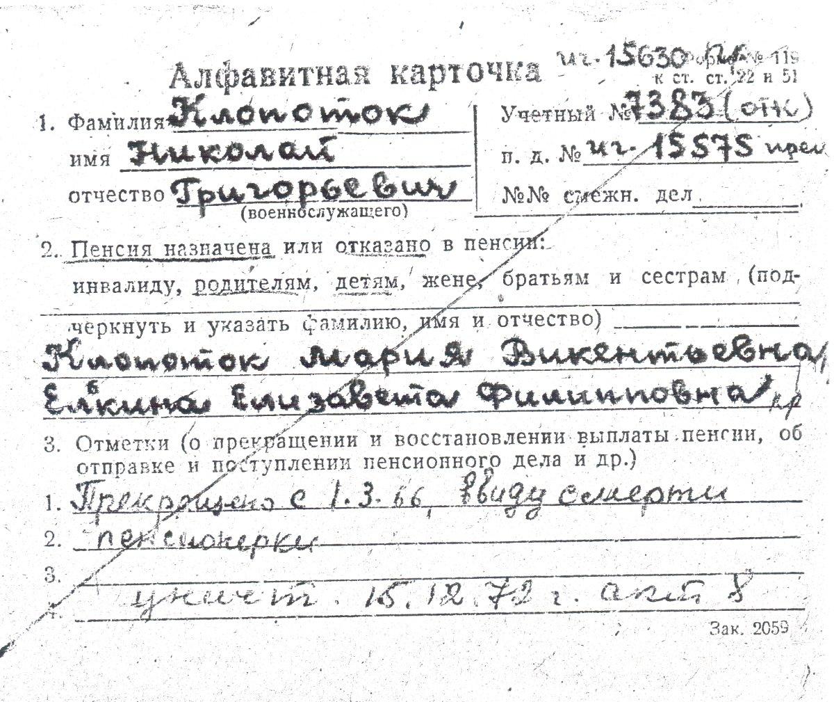 Из Гомельского военкомата 26 февраля 2016 г. мне ответили, что «в архиве финансово-социального отдела военного комиссариата Гомельской области находится Алфавитная карточка на Клопоток Николая Григорьевича. Пенсия была назначена Клопоток Марии Викентьевне, и ввиду смерти выплата пенсии была прекращена с 1 марта 1966 г. В Алфавитной карточке также указана Елькина Елизавета Филипповна». Илл. 46.