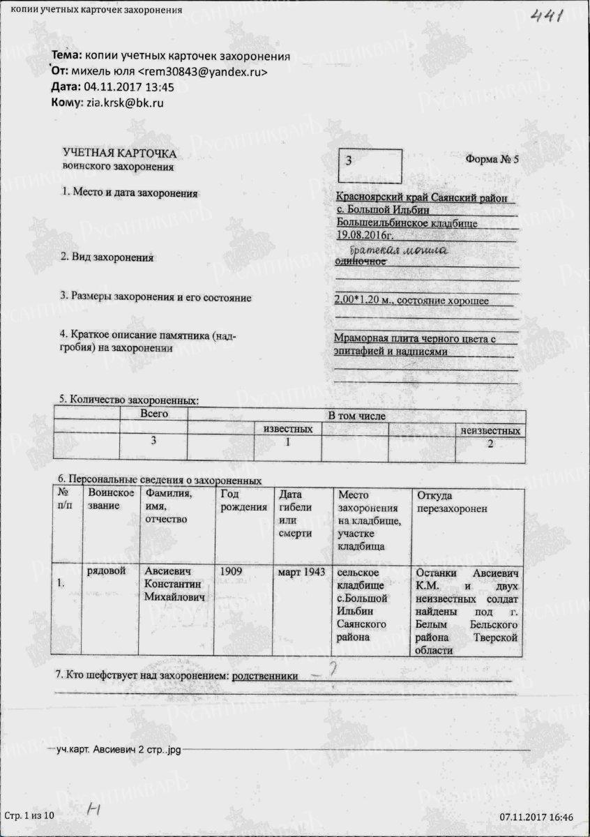 Учётная карточка воинского захоронения. Авсиевич К.М. + 2 неизвестных воина.