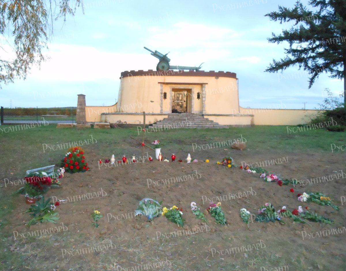 На обелиск укрепили красное полотнище и поставили зажженные лампадки, а около времянки установили сбитый наскоро крест.