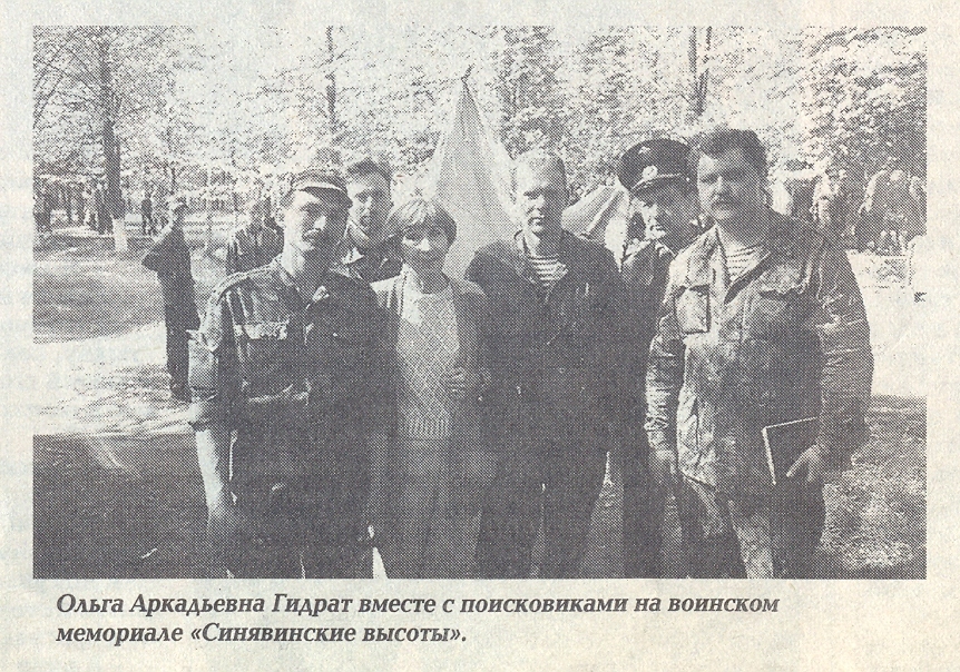 В урочище Гонтовая Липка, вверх по течению реки Черная, в 20 метрах от немецкого ДЗОТа 59 лет лежали останки младшего лейтенанта Гидрата. Вместе с Аркадием Антоновичем лежал еще один боец, к сожалению оставшийся безымянным. Скорее всего, это был связной командира роты. В результате осенней экспедиции 2000 года, на воинском мемориале «Синявинские высоты» мы похоронили останки 700 солдат и командиров Красной Армии.
