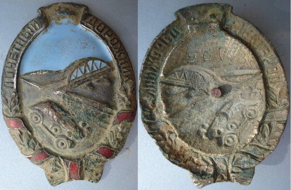 Дальнейшая работа по установлению личности погибшего воина привела нас к тому, что мы обнаружили свою ошибку в определении ведомственной принадлежности найденного значка. Наш значок «Почётный дорожник» - цельноштампованный, латунный, без накладных машинки и венка. Накладная только звёздочка.