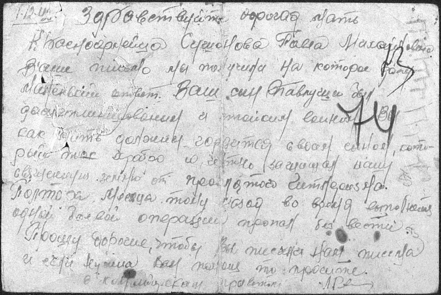 «Здравствуйте, дорогая мать красноармейца Сушенова Павла Михайловича. Ваше письмо мы получили, на которое Вам маленький ответ. Ваш сын Павлуша был дисциплинированным и стойким воином. Вы как мать должны гордиться своим сыном, который так храбро и честно защищал нашу священную землю от проклятого гитлеровца. Полтора месяца тому назад во время выполнения одной боевой операции пропал без вести.