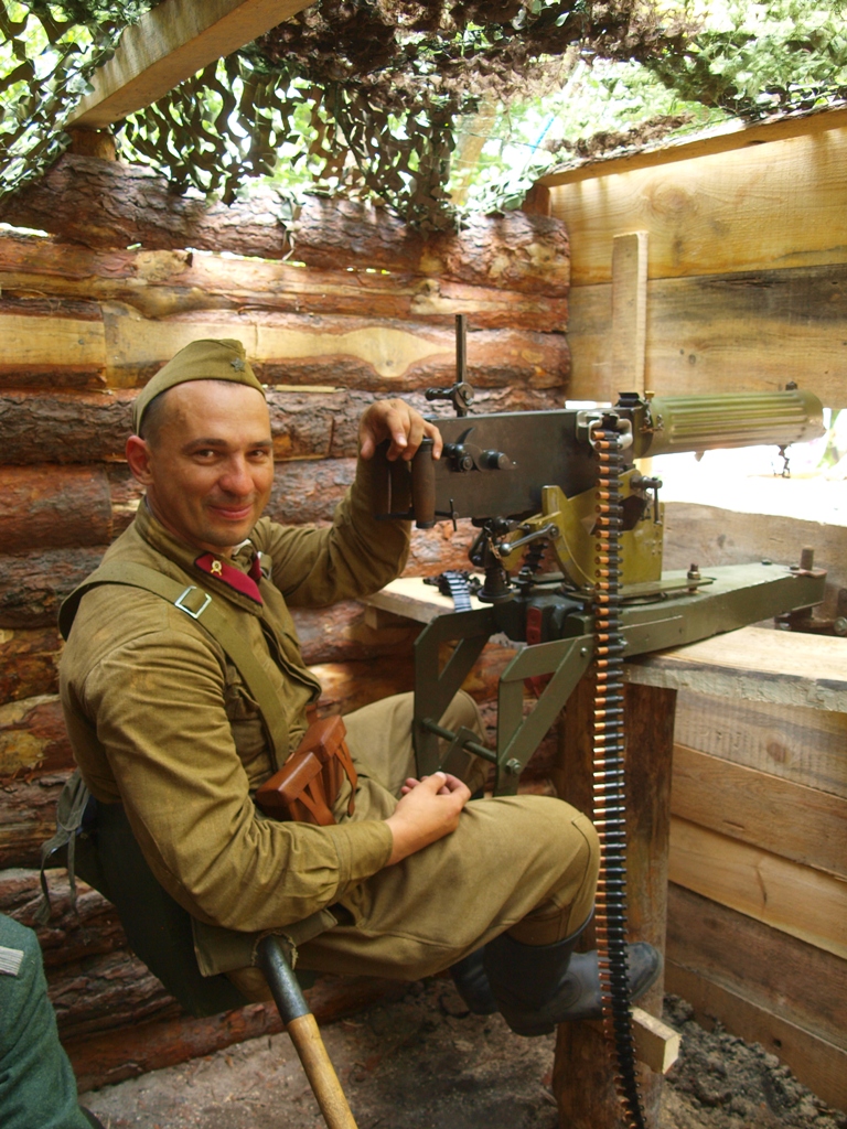 И еще! Конечно же вы не могли не заметить у реконструкторов боевых красных знамен. Это знамена 175-й стрелковой дивизии и 28-го отдельного пулеметного батальона. Мы решили вернуть погибшие в Киевском котле воинские соединения к жизни. Знамена шиты согласно положению о боевом Красном Знамени. На всех последующих реконструкциях на рубежах южного сектора КиУР 28 ОПБ будет воевать в ДОТах, 175 СД – в полевом заполнении. Таким образом, мы будем возрождать славную историю обороны Киева и укреплять память о ее героях. Может быть несколько пафосно, но главное сказано. Многие участники реконструкции отнеслись к этому не как к игре, а как к полному погружению в события тех далеких лет. Сотни благодарностей и десятки предложений оказывать помощь и содействие в восстановлении ДОТов пришло к нам после 22 июня 2013 года.