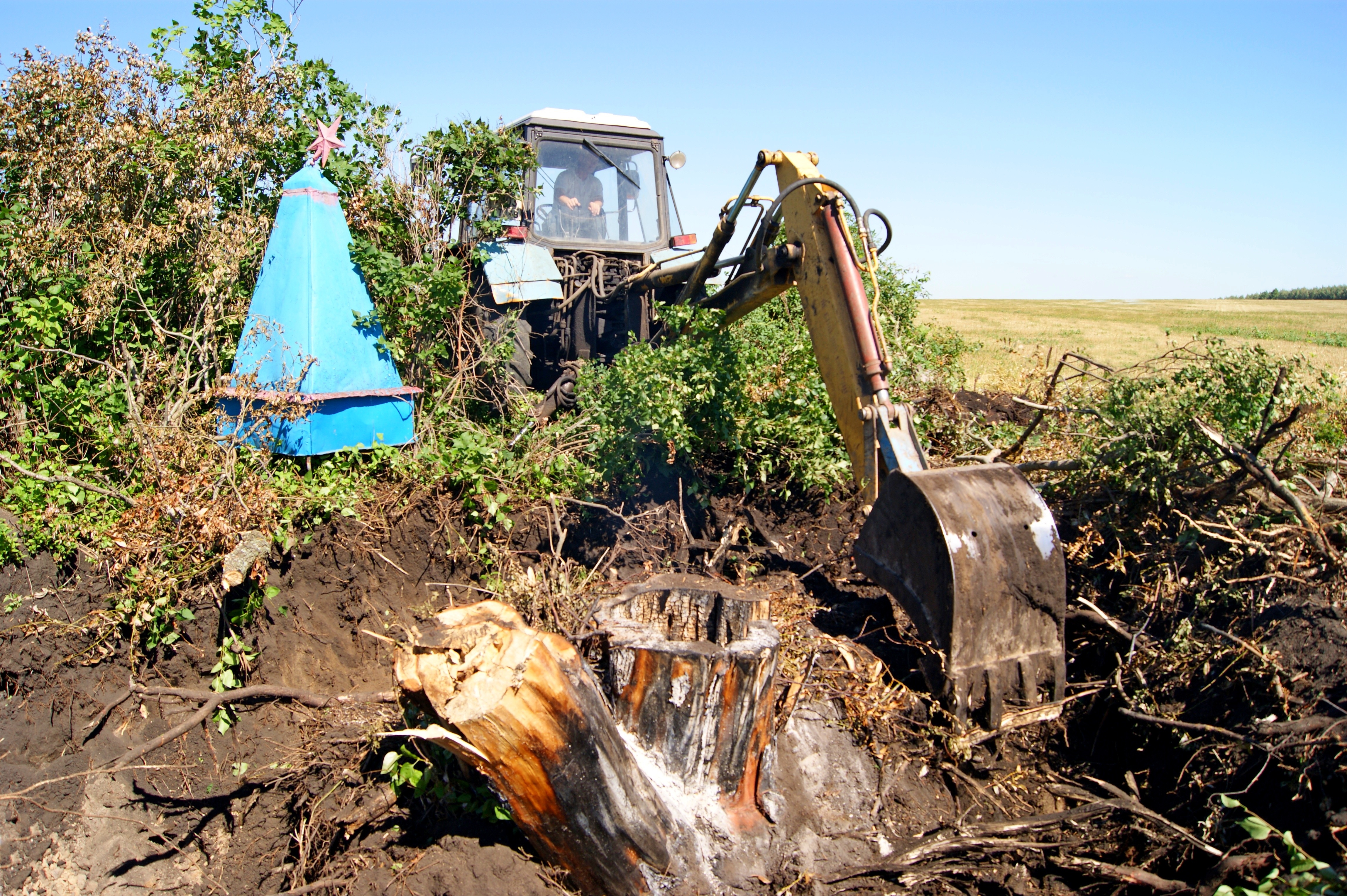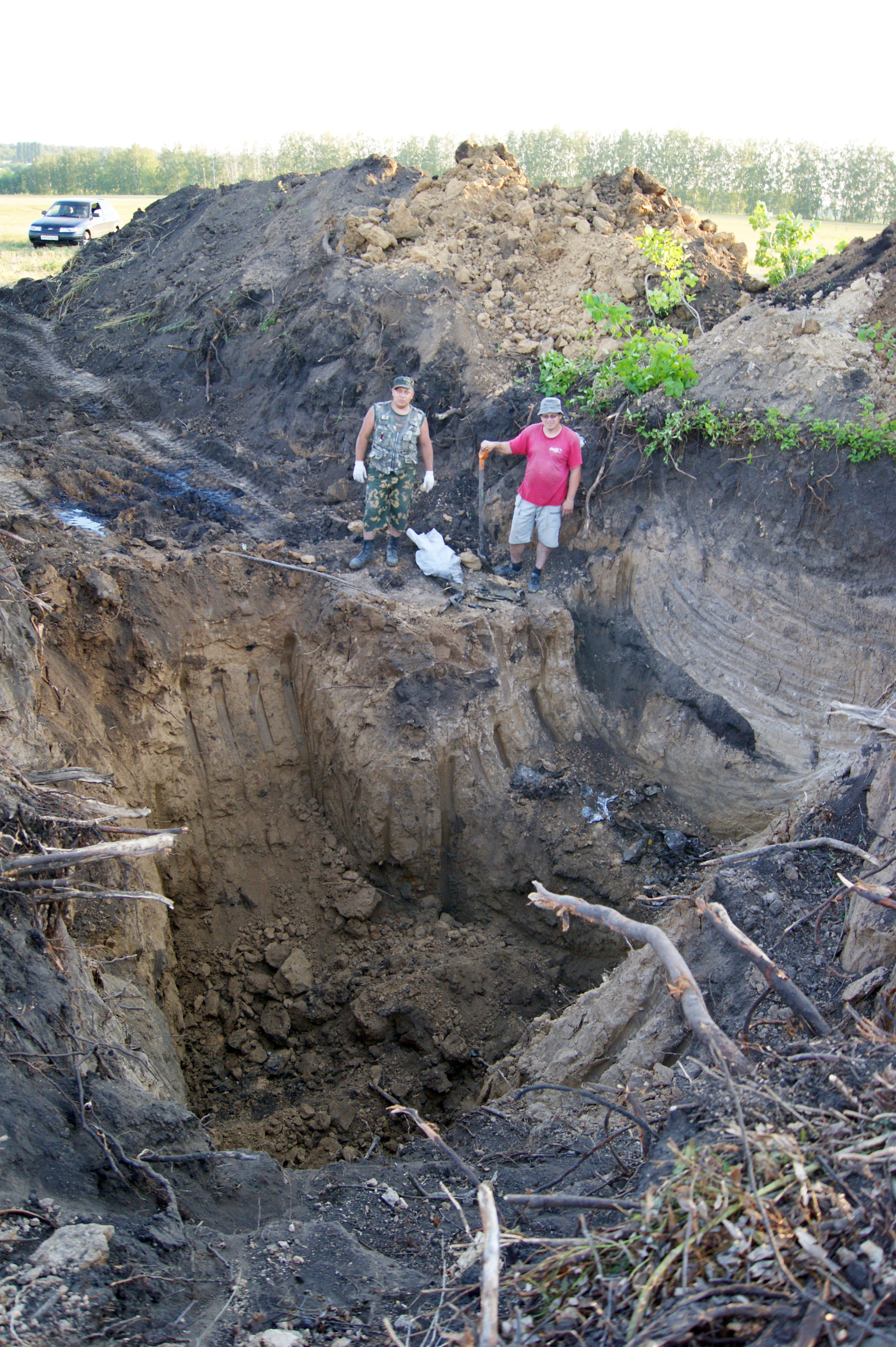 Ранним утром 25 июля 2012 года поисковики Роман Бронников, Роман Ушаков, Юрий Хохлов во главе с Владимиром Омельянчуком прибыли на место предполагаемого раскопа. Предстояла трудная работа - выкорчевка огромного пня. На горизонте появилась машина главы сельского поселения. Сергей Бачурин привез хорошую весть - должны прибыть экскаватор и трактор, обещанные главой района. Первым прибыл экскаватор, который сразу же приступил к работе. Очень быстро он окопал пень на два метра в глубину. Мы тщательно перебирали отвал в надежде найти что-нибудь, связанное с самолетом. Попадались фрагменты обшивки кабины, фюзеляжа и прочий деформированный металл.