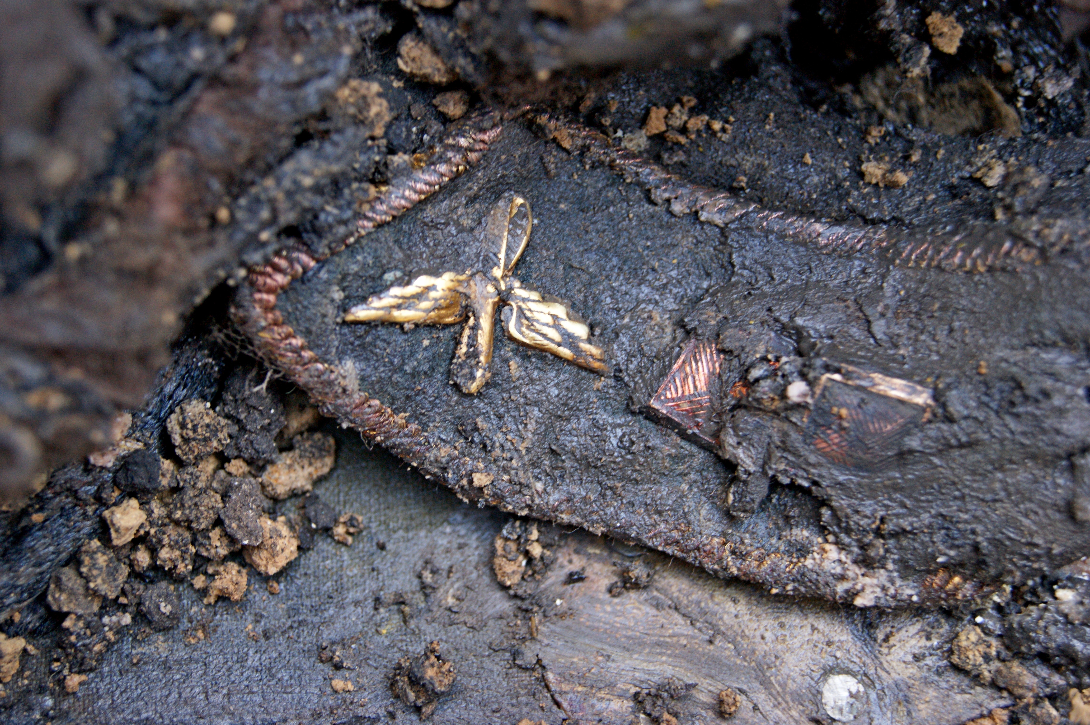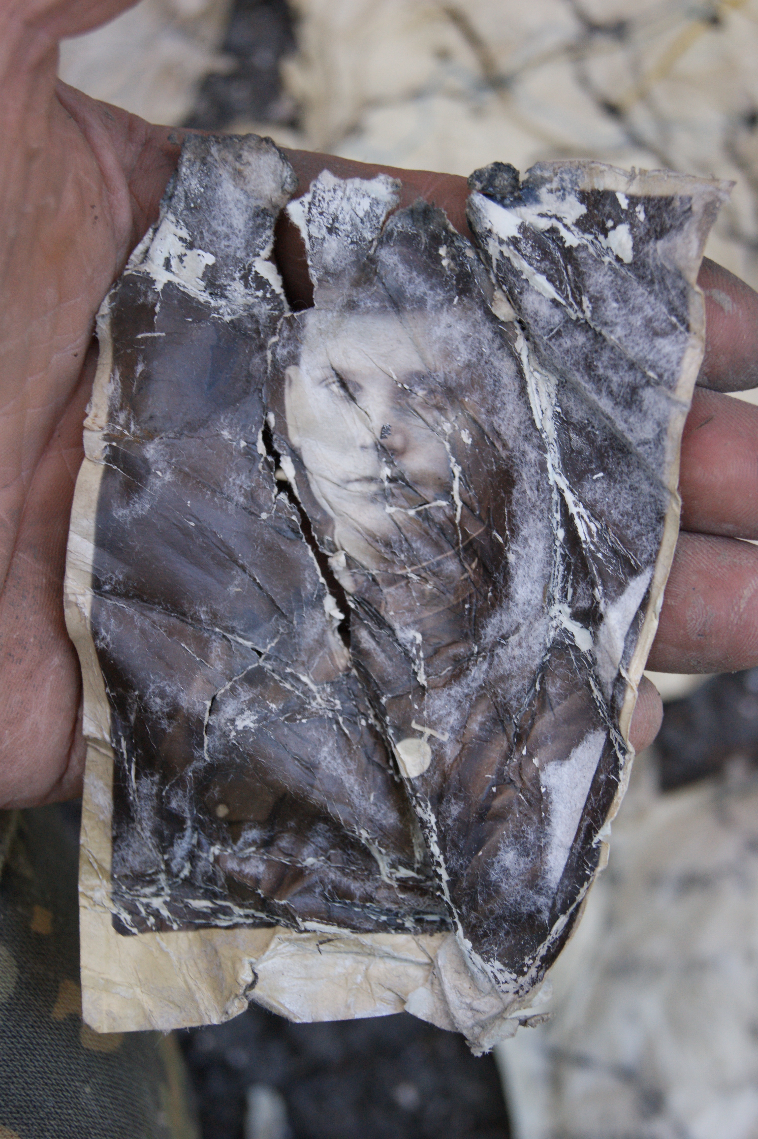 Немного позже нам удается извлечь на поверхность отлично сохранившийся парашют, рваный ремень с кобурой, фрагменты комбинезона летчика и его нижнего белья, перчатку с торчащим из нее человеческим пальцем. На отвале ребята находят три, отлично сохранившиеся фотографии и обрывки карты местности. На одном из фото молодой мужчина в военной форме, с двумя кубиками в петлицах и медалью на груди. На обратной стороне фотографии надпись:«Коми
