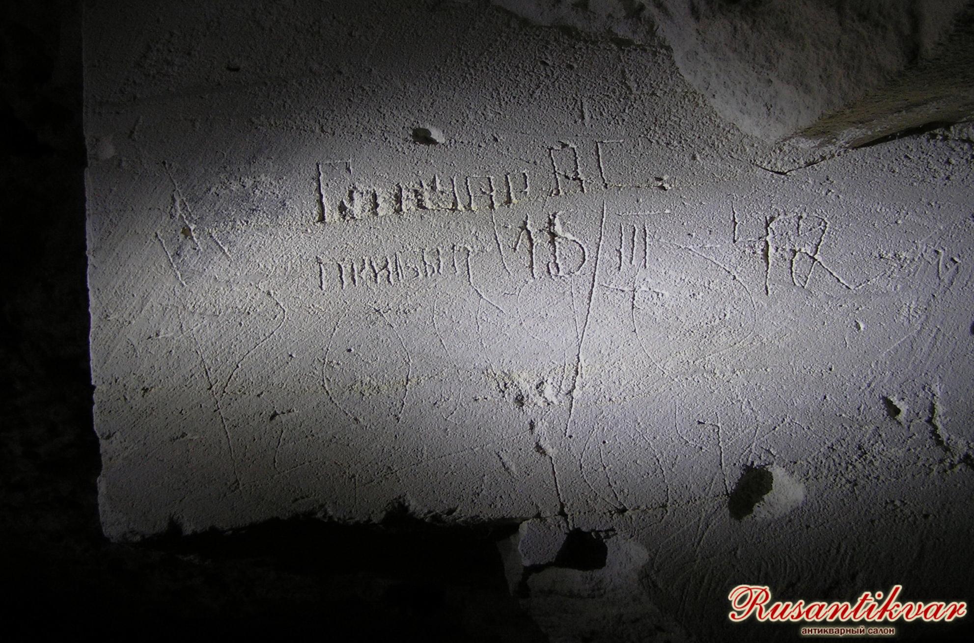 Но это были не единственные следы пребывания здесь военнослужащих, проходивших проверку. На одном из участков каменоломен удалось найти несколько надписей процарапанных на стенах и карнизах: «Гончар П.Г. прибыл 18/III-42», «Садыков И.А. 12/III-42 г.», «15/III-42 г. Садыков И.А.», «Оборнев Д.Е. прибыл 15/III-42», «Бондаренко Д.М. прибыл 15/III-42», «Кисеев А.Д. прибыл 22/III-42 г.», судя по датам, относившихся к интересующему нас эпизоду. А чуть в стороне и еще одну, написанную углем, явно указывающую, что мы действительно нашли, то, что искали: