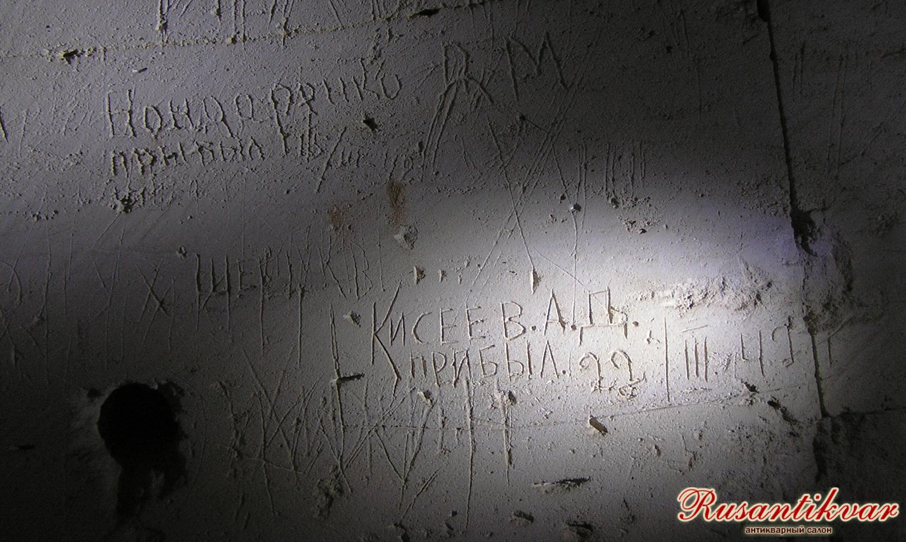Надписи, оставленные на стене целика проходившими фильтрацию Д.М. Бондаренко и А.Д. Кисеевым