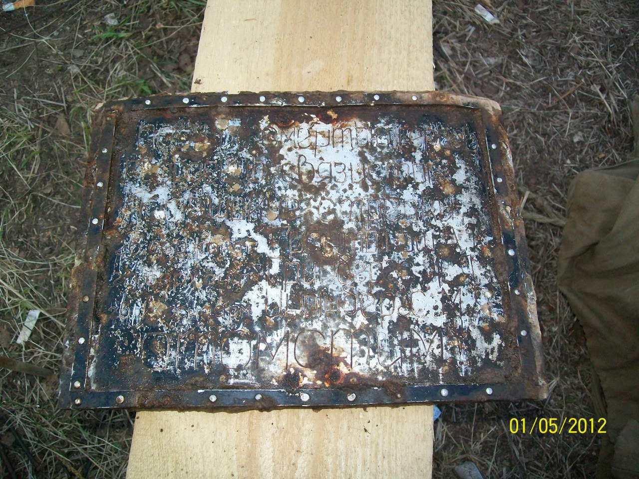 На следующий день туда весь отряд пошел. Не близко. 5 километров. Треть - по полям, остальное - по лесу. Пока все работали на поляне, бегунки взяли с собой еще несколько человек и пошли на свой вчерашний раскоп. Подняли 3 солдат, 1 медальон и табличку. Видимо, бойцов однополчане после боя прикопали и на деревянной стойке табличку разместили.