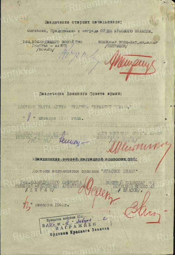 Орден «Боевого Красного Знамени СССР» 23601 за уничтожение группы фашистов и занятие моста.