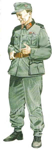 На артиллеристе серо-зеленый мундир образца 1941 года с темно-зеленым воротником и погонами.