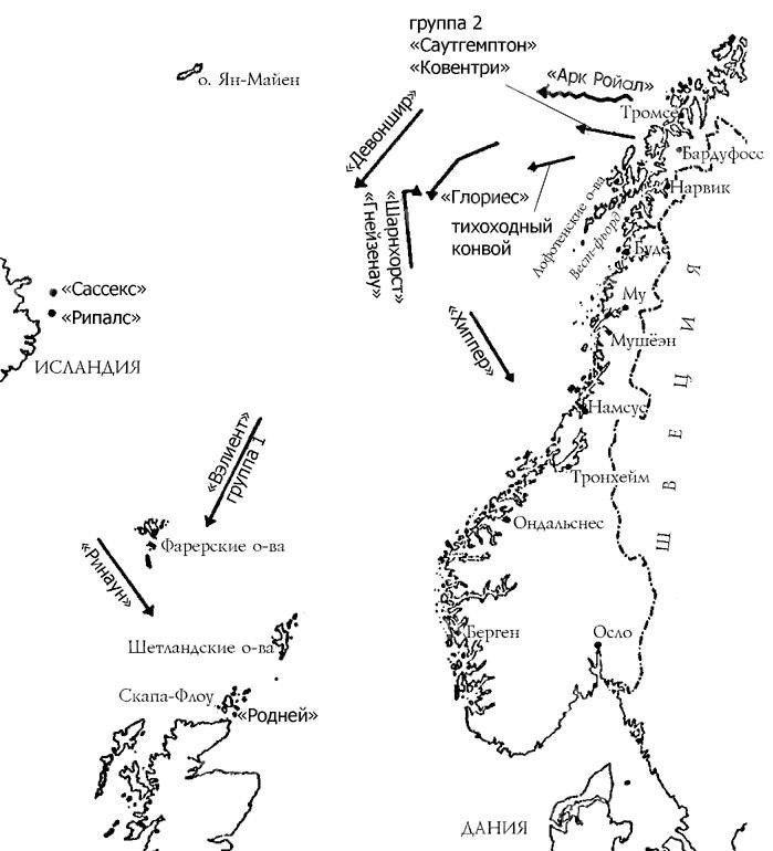 Замеченным немцами кораблем был «Глориес», который со 2 июня обеспечивал под Нарвиком воздушную поддержку эвакуации союзных войск (операция «Алфавит») в составе авианосного соединения вице-адмирала Л. В. Уэллса (авианосцы «Арк Ройял», «Глориес» и 5 эсминцев). 9 июня оба авианосца должны были присоединиться к эскорту покидающего Нарвик второго большого союзного конвоя, однако утром 8 июня командир «Глориеса» кэптен Г. Д. Ойли-Хьюз запросил у адмирала Уэллса разрешение немедленно самостоятельно следовать на базу в Скапа-Флоу. Причиной такой просьбы был острый конфликт между командиром авианосца и начальником авиагруппы корабля коммандером Д. Б. Хотом, что требовало срочного решения военного суда на базе. По другой версии, «Глориесу» требовалось срочно идти на базу из-за исчерпания запасов топлива. После получения разрешения, «Глориес» в сопровождении эсминцев «Ардент» и «Акаста» двинулся в сторону метрополии. Следует отметить, что в Норвежской кампании одиночные переходы авианосцев с минимальным эскортом были типичны для Королевского флота, так как британское командование не допускало появления здесь крупных надводных сил противника.
