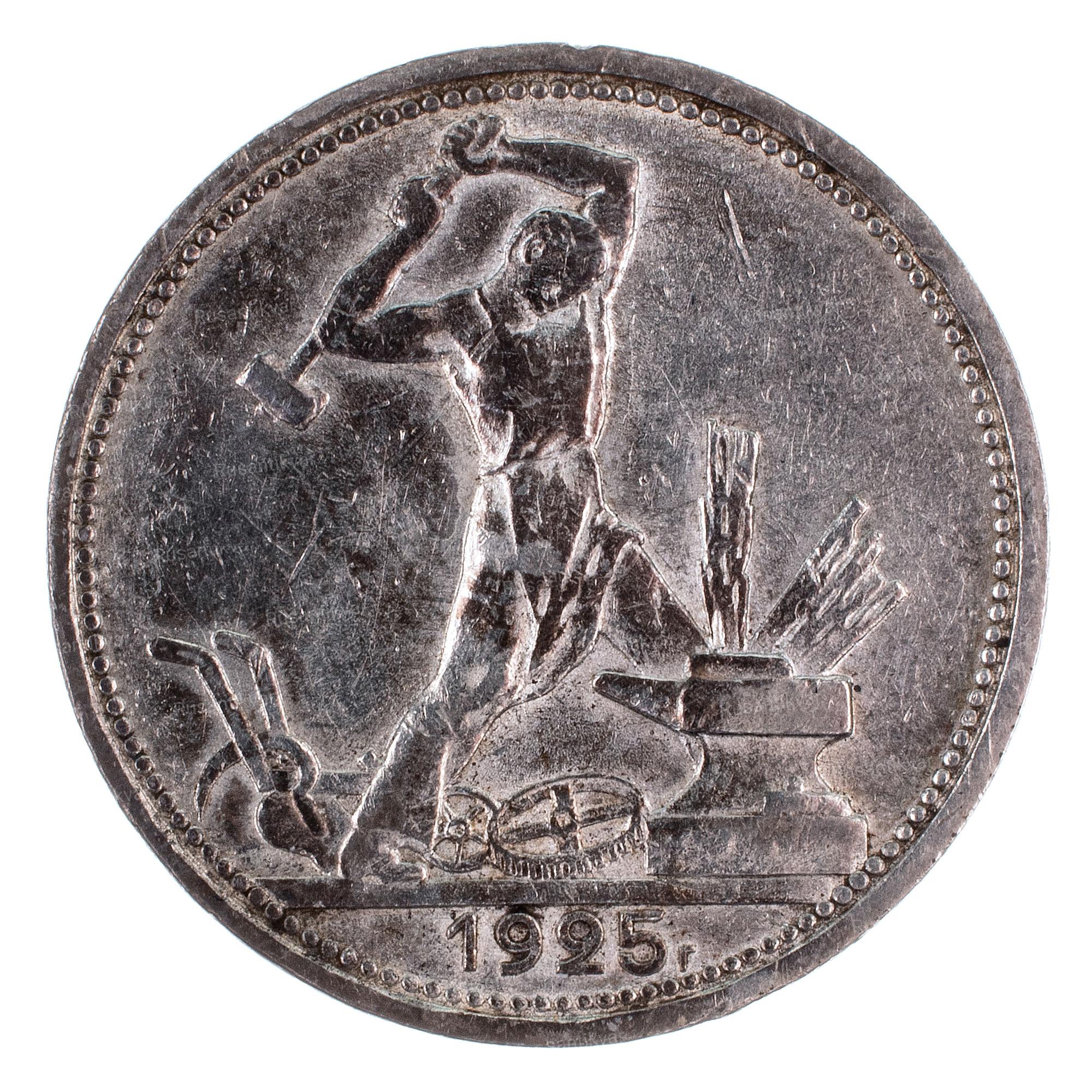 В 1925 году полтинник изготавливался из сплава 900 пробы, массой ровно в 10 грамм, то есть монета содержала 9 грамм чистого драгоценного металла. Об этом свидетельствует вдавленная гуртовая надпись "чистого серебра 9 грамм П.Л" где П.Л - это инициалы начальника Ленинградского монетного двора Петра Латышева, чиновника, который был минцмейстером ещё при последнем Императоре Николае II.