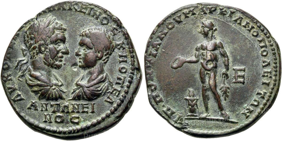 АВЕРС: ΑΥ. Κ. ΟΠΕΛ. ϹΕΥ. ΜΑΚΡΕΙΝΟϹ Κ. Μ. ΟΠΕΛ. ΑΝΤΩΝΕΙΝΟϹ — лицом к лицу драпированные бюсты Макрина, слева, в доспехах и в лавровом венке, и Диадумениана, справа, с обнаженной головой.
