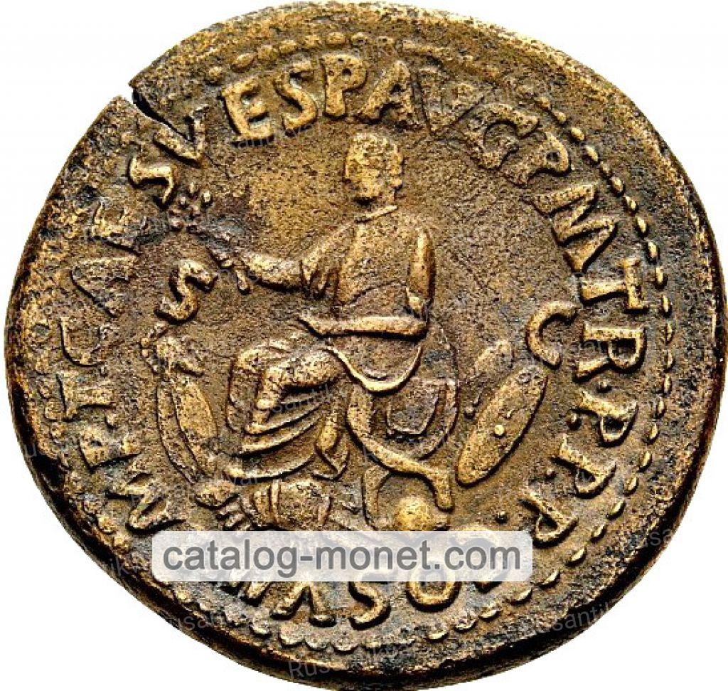 IMP. T. CAES. VESP. AVG. P. M. TR. P. P. P. COS. VIII — Тит в тоге с обнаженной головой сидит влево на курульном кресле держит ветвь в протянутой правой руке и свиток (?) в левой; слева овальный щит и шлем возле кресла доспехи (?) и шлем справа два овальных щита и два копья. В поле слева и справа: S. C.
