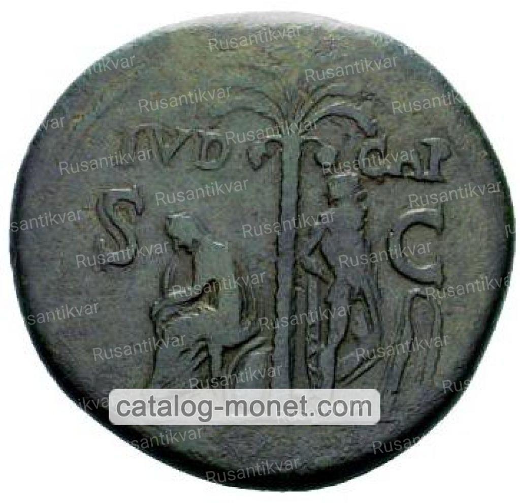 IVD. CAP. — иудейка в драпировке с покрытой головой сидит влево на щитах под пальмой плачет голова опирается на правую руку которая опирается на правое колено; справа от пальмы вправо стоит иудей голова повернута назад налево его руки связаны за спиной; справа — ярмо (?). В поле слева и справа большими буквами: S. C.