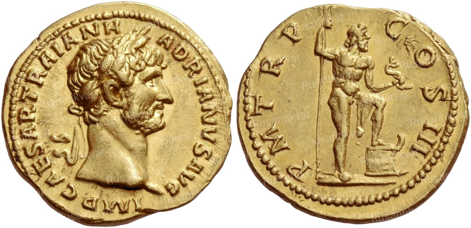 АВЕРС: IMP. CAESAR TRAIAN. HADRIANVS AVG. — драпированный бюст Адриана в доспехах и в лавровом венке вправо.