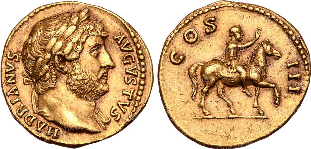 РЕВЕРС: COS. III — Адриан, в военной одежде, верхом на коне вправо, подняв правую руку в приветствии.
