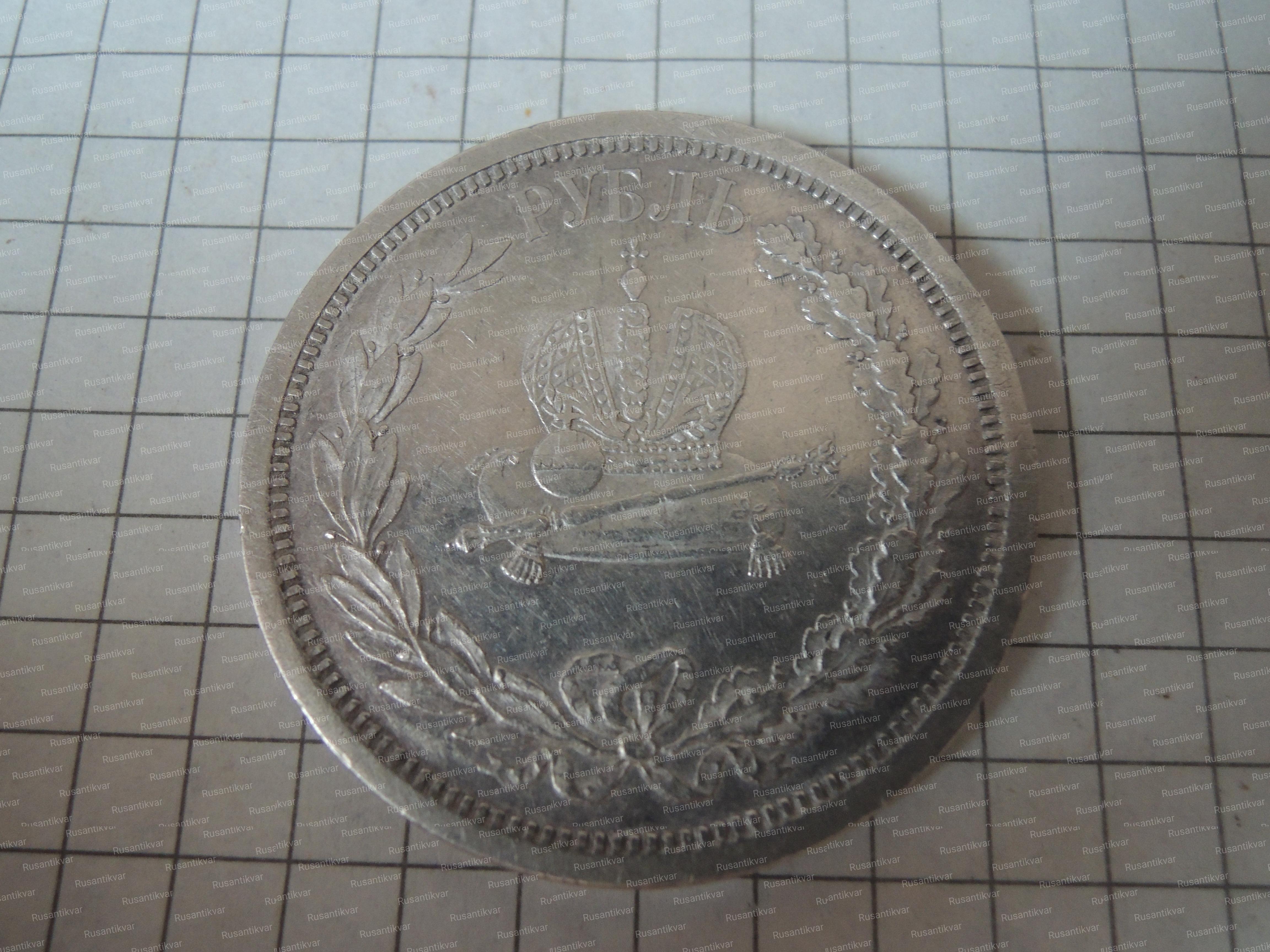 На реверсе: на подушке символы власти - Большая Императорская корона, скипетр и держава в обрамлении венка из дубовых и лавровых ветвей связанных лентой. Сверху номинал «РУБЛЬ».