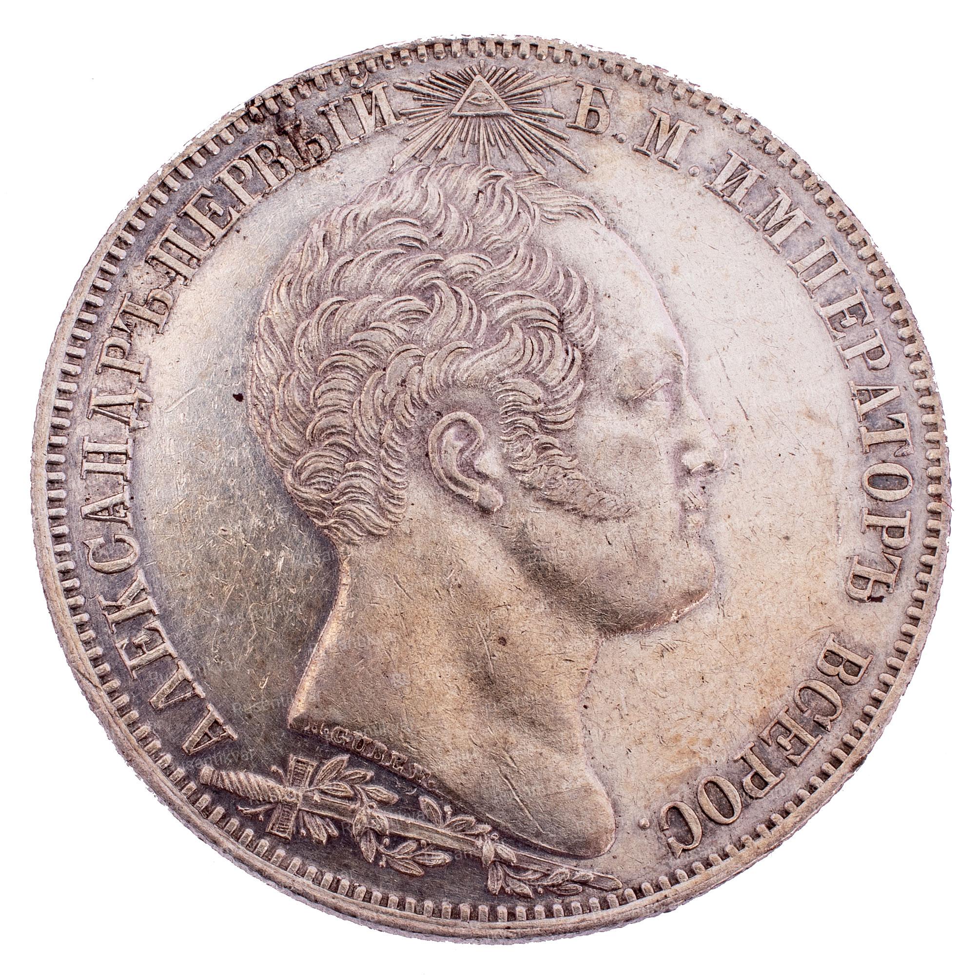 Реверс: Центр аверса занят правым профилем Александра I. В обрезе шеи инициалы медальера «H. GUBE F. » — А. И. Губе. Над головой императора — «всевидящее око» в лучах. Под портретом — меч, увитый лавровой ветвью. Слева от портрета, вдоль канта, текст: АЛЕКСАНДРЪ ПЕРВЫЙ справа — «Б. М. ИМПЕРАТОРЪ ВСЕРОС.». Буртик украшен зубчиками.