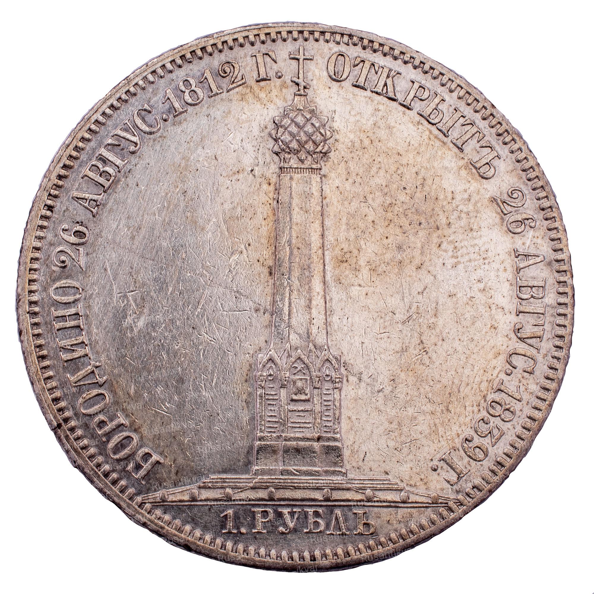 Аверс: В центре изображение Бородинского памятника — часовни. Под памятником обозначение номинала — надпись «1. РУБЛЬ». Вокруг памятника, вдоль канта, текст: БОРОДИНО 26 АВГУС. 1812 Г. ОТКРЫТЪ 26 АВГУС. 1839 Г. Буртик украшен зубцами.