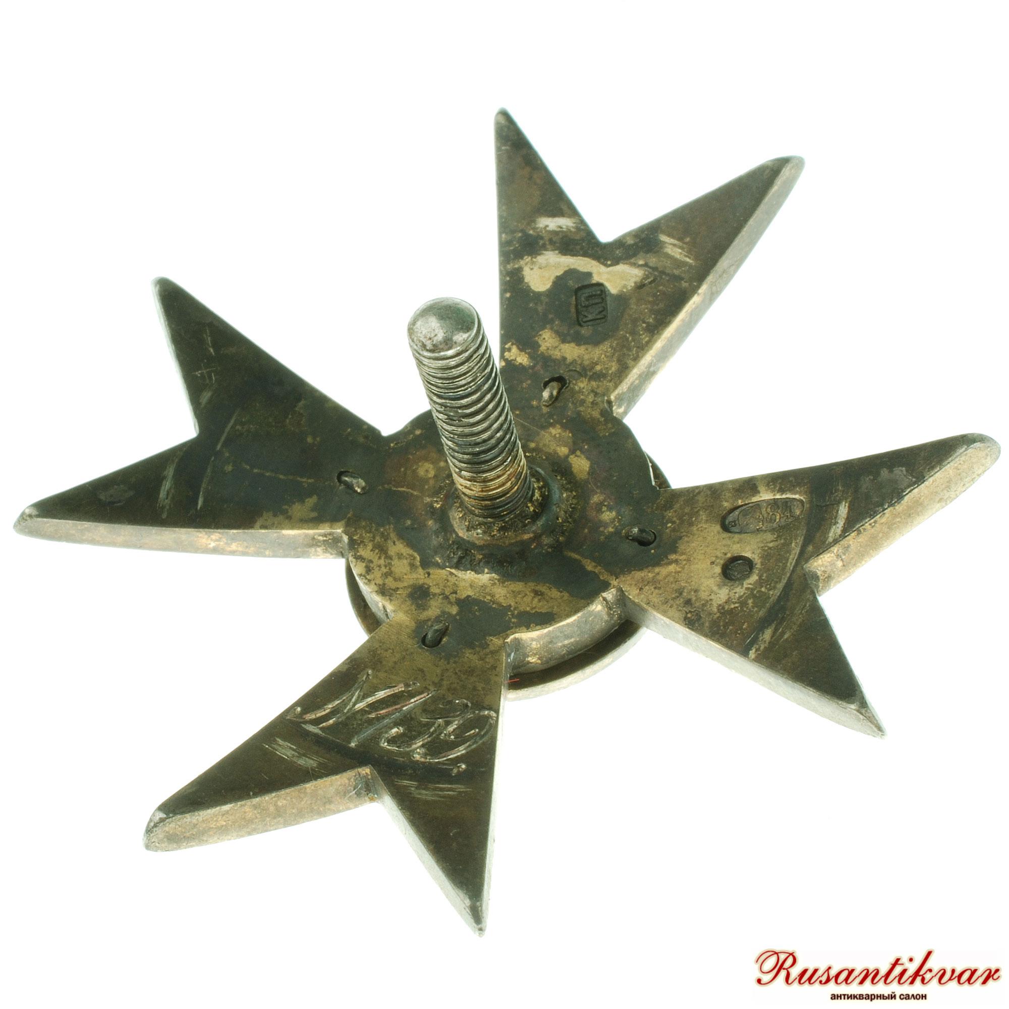 Знак для окончивших Чугуевское военное училище, № 139. С.-Петербург, 1913–1917 гг. Фирма «Э.Кортман». Клейма на об. ст. знака: СПб окружного пробирного управления в овальном щитке [альфа, женская головка в кокошнике, вправо, 84], круглый знак удостоверения и именное клеймо «КП».На серебряной а гайке — клеймо фирмы «Ф.МЮЛЛЕРЪ". Серебро, позолота, эмаль, 34,94 г. Размеры 45,8×45,3 мм. Сохранность очень хорошая, гайка от другого знака. Патрикеев, Бойнович.1# 1.2.3. Утвержден 4 октября 1913 г. На об. ст. знака на нижнем конце креста выгравирован номер: «№ 139.».