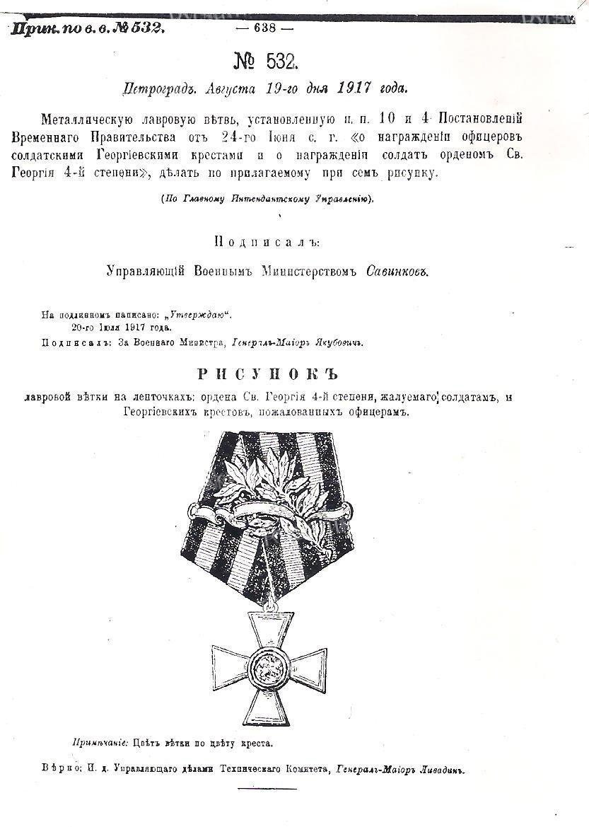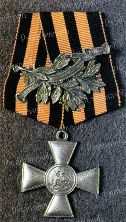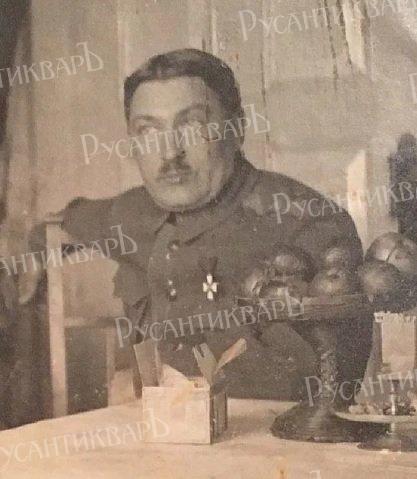 Приказом по 272-му пехотному Гдовскому полку № 329 от 31 августа 1917 года, за отличия, оказанные в делах против неприятеля, награждён солдатским Георгиевским крестом 4-й степени с лавровой ветвью (для награждения офицеров):
