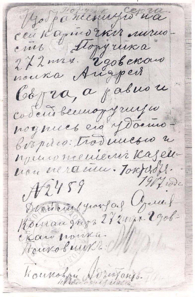 К марту 1918 года офицеры и солдаты 272-го пехотного Гдовского полка были демобилизованы, полк расформирован, и Андрей Григорьевич Серга вернулся на родину.