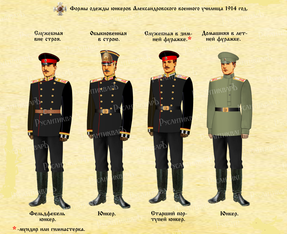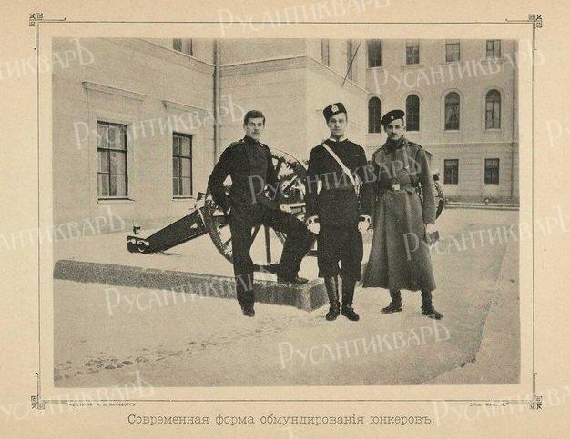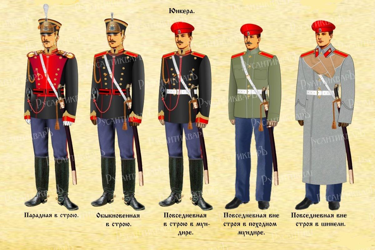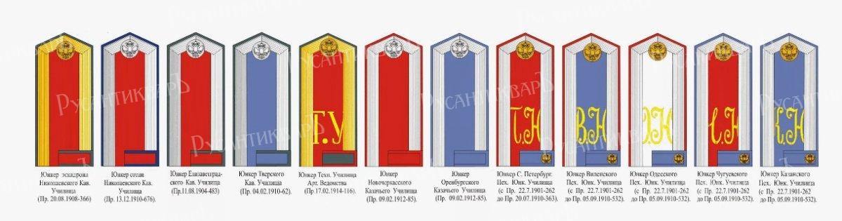 Российская Империя всегда рождалась, жила и умирала в мундире. Начало 20-го века было действительно последним временем, когда мундир носили все от кучеров до гимназистов, чиновников и офицеров. Мундир был символом, символом служения Царю и России. В силу этого на протяжении всей Отечественной истории формировалась определенная культура мундира со своими традициями и особенностями. Юнкера военных училищ были привилегированными чинами - они имели унтер-офицерские отличия: галун цвета металлического прибора по воротнику и обшлагам и пуговицу на клапане воротника шинели. Носили они также на воротнике и обшлагах басонные петлицы: желтые гвардейские - в Николаевском кавалерийском училище и белевые армейские - в остальных.
