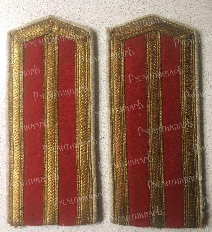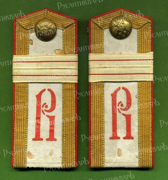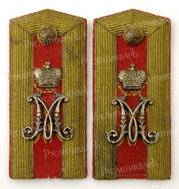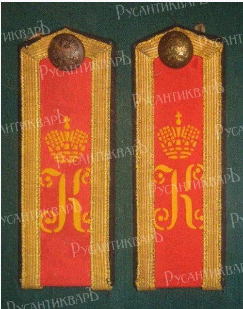 ФОРМА ЮНКЕРОВ Юнкерские погоны обшивались по краям золотым или серебряным галуном. В Павловском училище носили алые погоны с желтым трафаретным вензелем императора Павла I. Воспитанники Константиновского - светло-синие с вензелем великого князя Константина Николаевича в виде буквы «К»; Александровского - белые с вензелем Императора Александра II «А II», Михайловского артиллерийского - алые с вензелем великого князя Михаила Павловича в виде буквы «М», Николаевского инженерного - алые, с вензелем «H I». Кушак у фельдфебелей Михайловского артиллерийского, Николаевского инженерного и Павловского училищ был алый, Константиновского - светло-синий, а Александровского - белый. Пуговицы и поясные бляхи красной меди с гренадой, а в Павловском, Александровском и Николаевском инженерном - с короной.