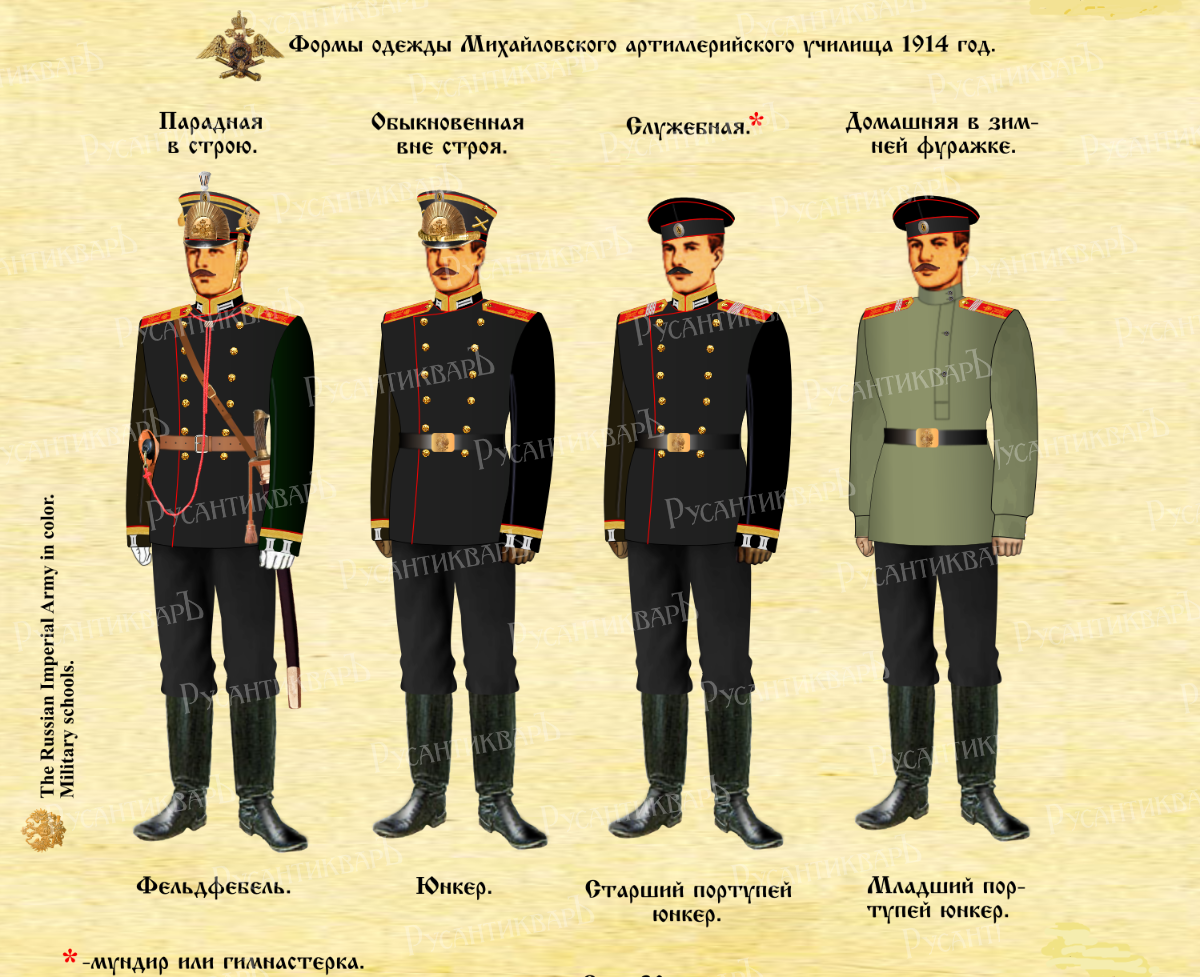 ФОРМА ЮНКЕРОВ. В те же годы юнкера Михайловского артиллерийского училища носили двубортный мундир с воротником из черного бархата и красной выпушкой вокруг воротника. Погоны юнкеров, обшитые узким галуном с литерой «М» под короной были красного цвета. Поясная бляха была гладкой, вороненой. Шапка артиллеристов отличалась от головных уборов других военных училищ черным бархатным околышем, обшитым красной выпушкой. Для обучения конно-артиллерийскому строю юнкера носили подшитые кожей рейтузы. Фельдфебелям-артиллеристам полагалась, помимо пистолета, шашка.