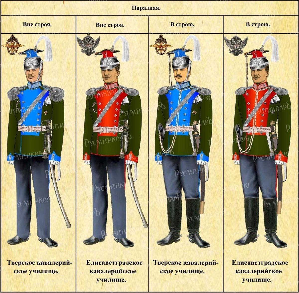 В 1904 г. изменился прикладной цвет Тверского училища. Он стал светло-синим вместо алого, прибор остался серебряный. Изменилась также шапка: теперь ее суконное дно стало светло-синим. Юнкера Елисаветградского кавалерийского училища, как входящего в Одесский военный округ, носили фуражку вместо шапки. А орел с барашковой шапки пригонялся на тулью, цвет которой был алым с темно-зеленой выпушкой и темно-зеленым околышем, а у «тверцов» тулья была светло-синей, выпушка темно-зеленая, околыш - темно-зеленый. В 1910 г. Тверское юнкерское училище было преобразовано в кавалерийское училище, а двумя годами позже обоим училищам на уланские шапки был пожалован герб военно-учебных заведений вместо Государственного герба, а офицерам - шитье военно-учебных заведений.