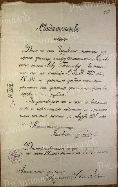 Интересный документ есть в архиве за 1895 год. Свидетельство о награждении юнкера Чугуевского пехотного юнкерского училища Льва Гоголева денежным призом от училища в размере 40 рублей. До 1910 года выпускные юнкера не получали от казны выходных денежных пособий. Получив долгожданные погоны, молодой офицер оказывался гол, как сокол. А нужна была новая форма, деньги на съем жилья, какая-то меблишка, разные вещи, необходимые в быту на новом месте службы... Потому получить денежный приз при выпуске было счастьем, за которое стоило побороться.